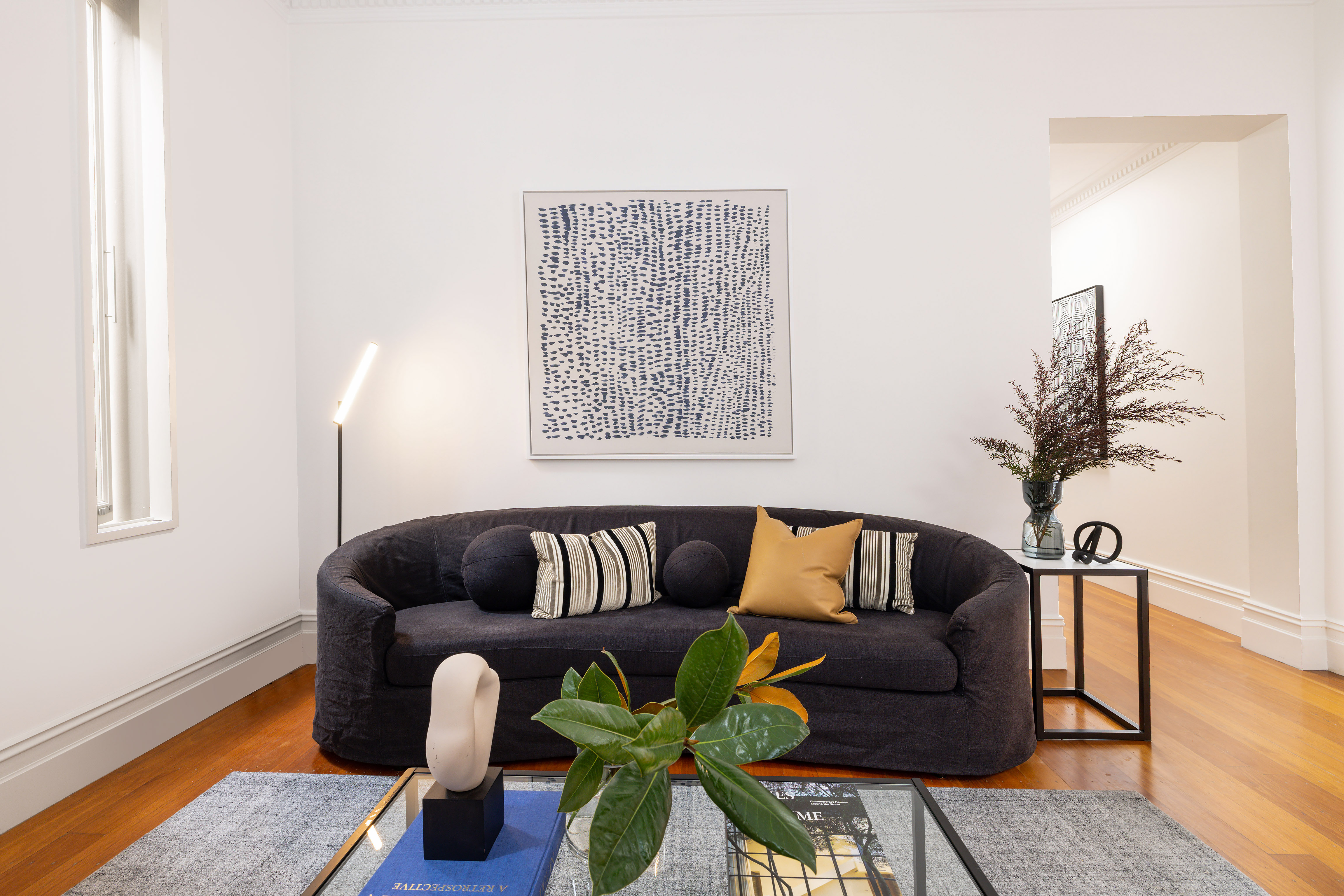 - Clean lines, floating stairs, wood floors