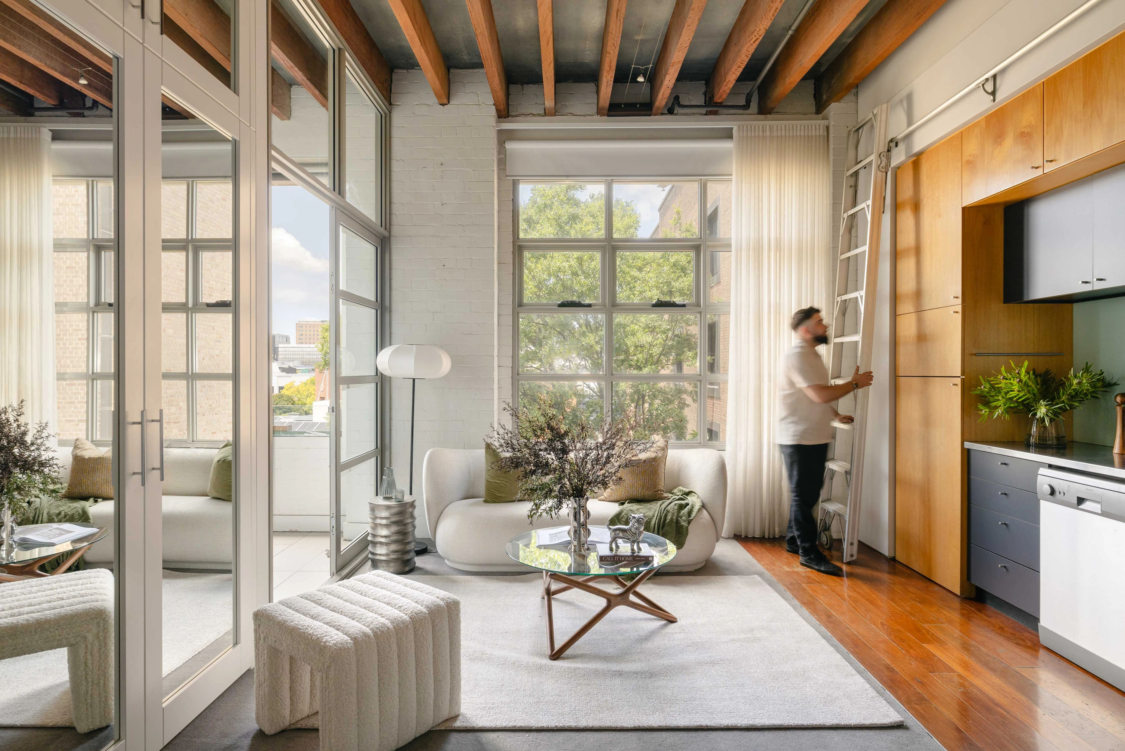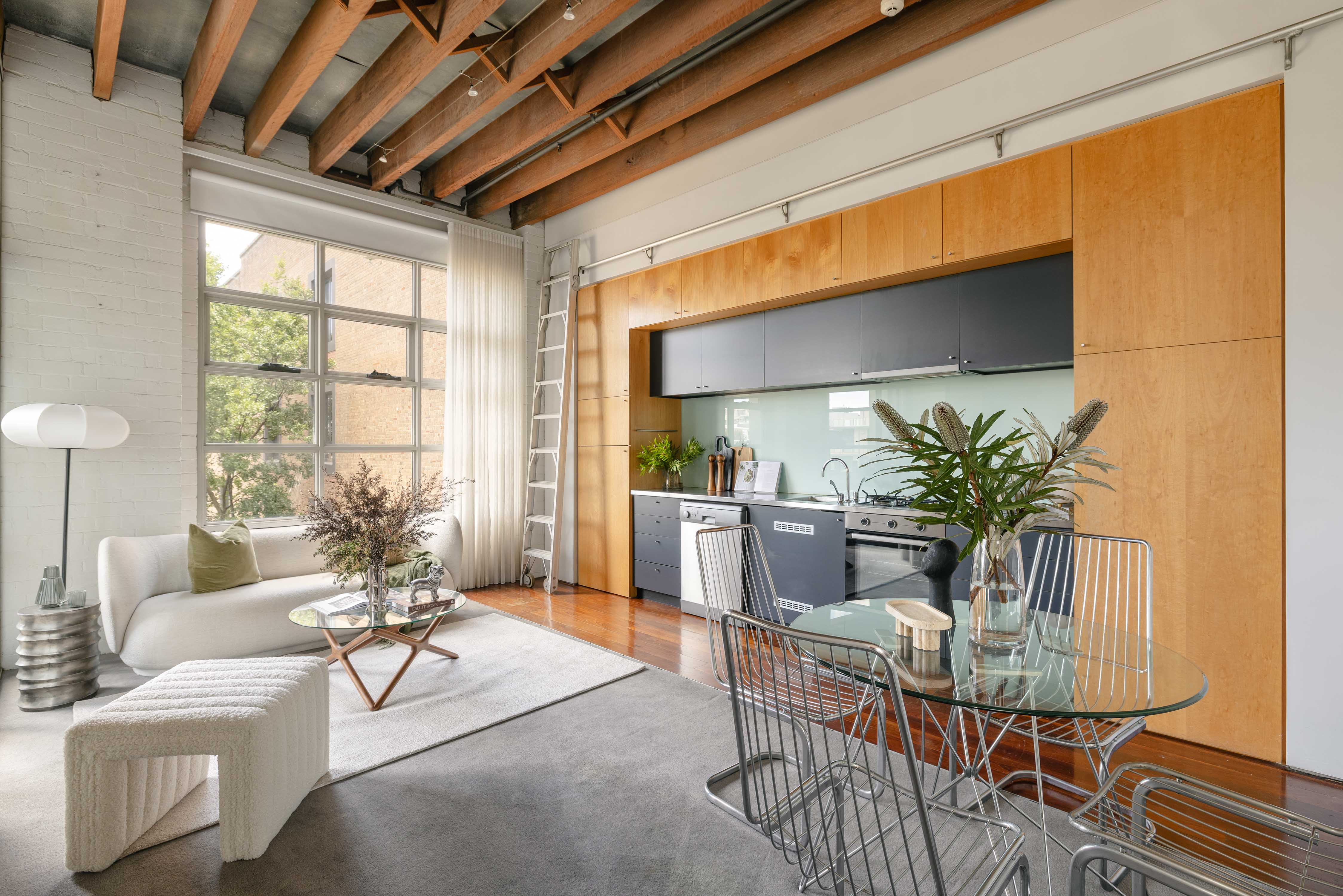 Enjoy quintessential warehouse living in one of the area’s most admired conversions – the 1930s Grace Bros building. All the signature industrial elements are here: 3.6m-high timber-beamed ceilings, oversized multi-pane windows, textured brick walls and rolling ladder storage. The bedroom is well separated by a central alfresco terrace, bringing a breezy openness and long rooftop outlooks. Stroll to the universities, RPA Hospital, Parramatta Road transport links and Booth Street village hub.