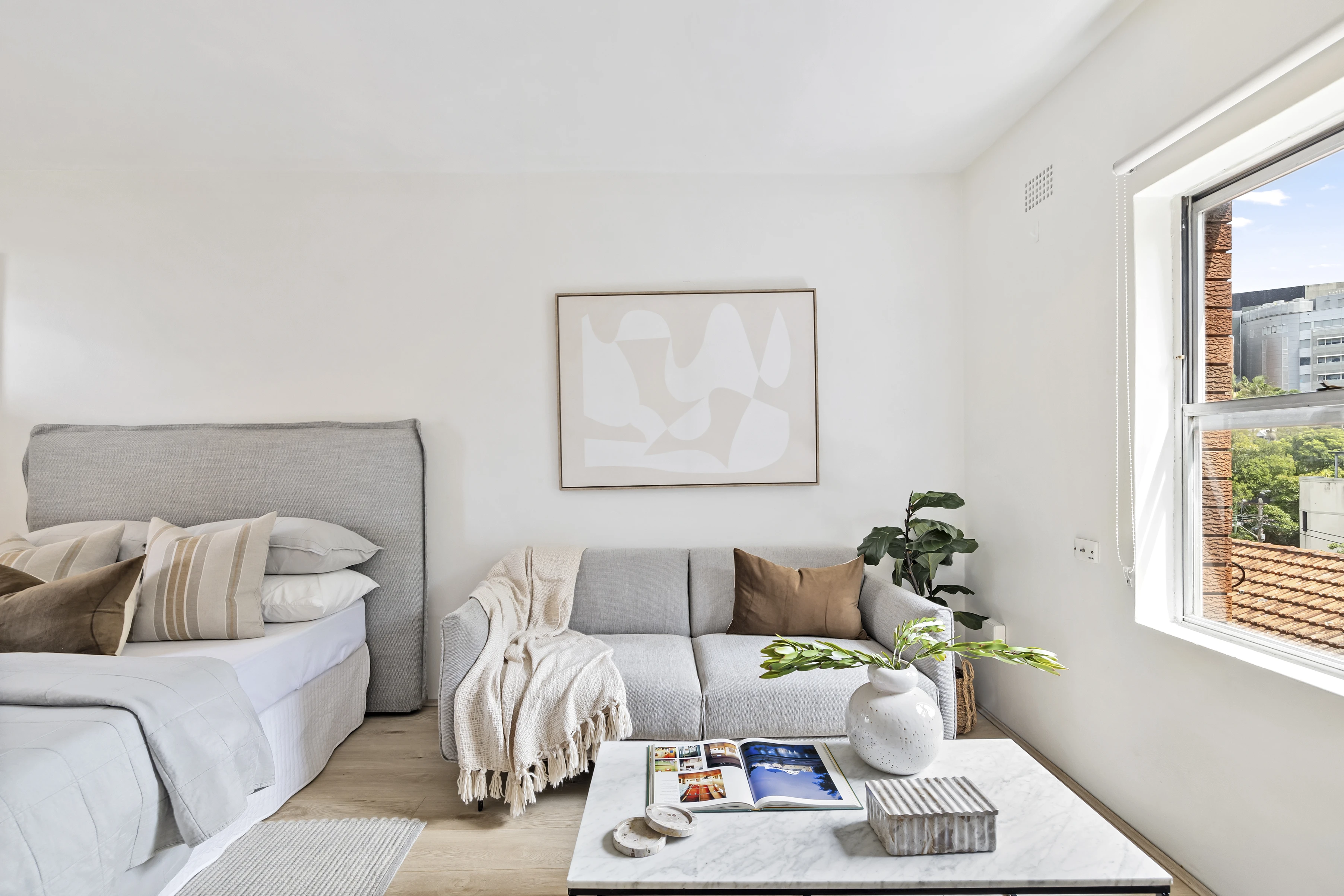 Buyers looking to enter the Paddington market or secure a high-yielding investment or low-maintenance city pad would be hard pressed to find a better studio than this top-floor apartment in Glenview Apartments. Capturing tranquil district views from its elevated setting, the fully renovated apartment's fresh Scandi-style aesthetic make a perfect first home or pied-à-terre. In a leafy enclave on the city fringe, the bright and airy studio comes with scramble parking and is an easy 300m walk up Liverpool Street to Victoria Street's celebrated dining scene and 750m to Kings Cross station.