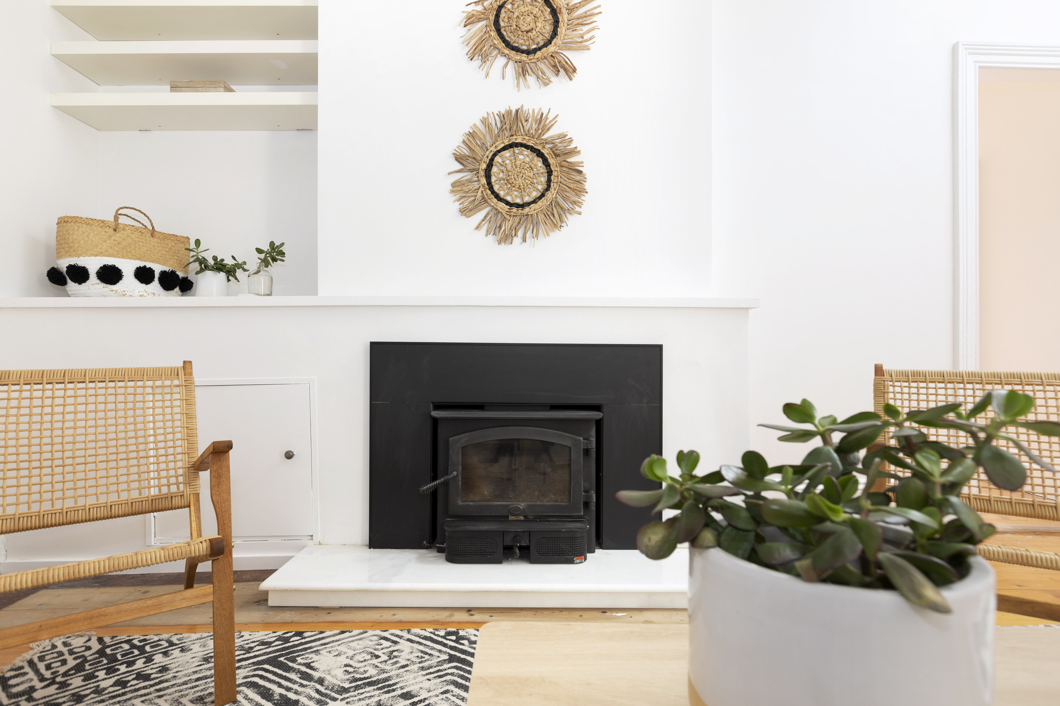 - Central living area with working fireplace