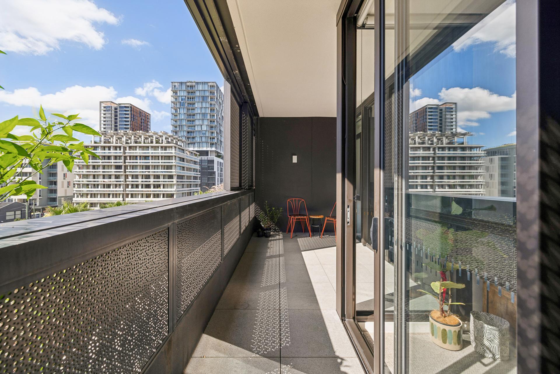 - Full-width balcony overlooks park outside