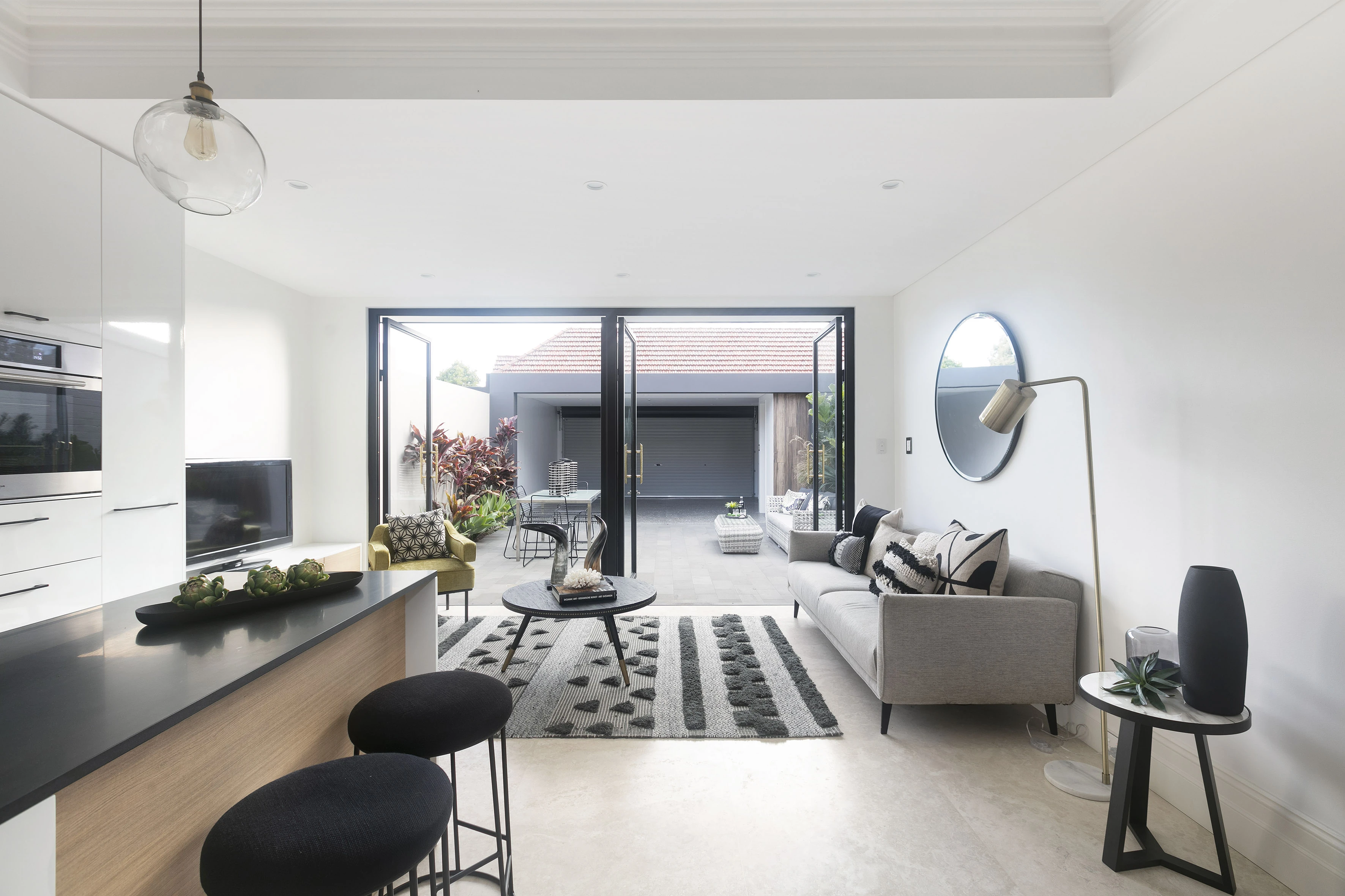 - Indoor/outdoor flow via glass french doors