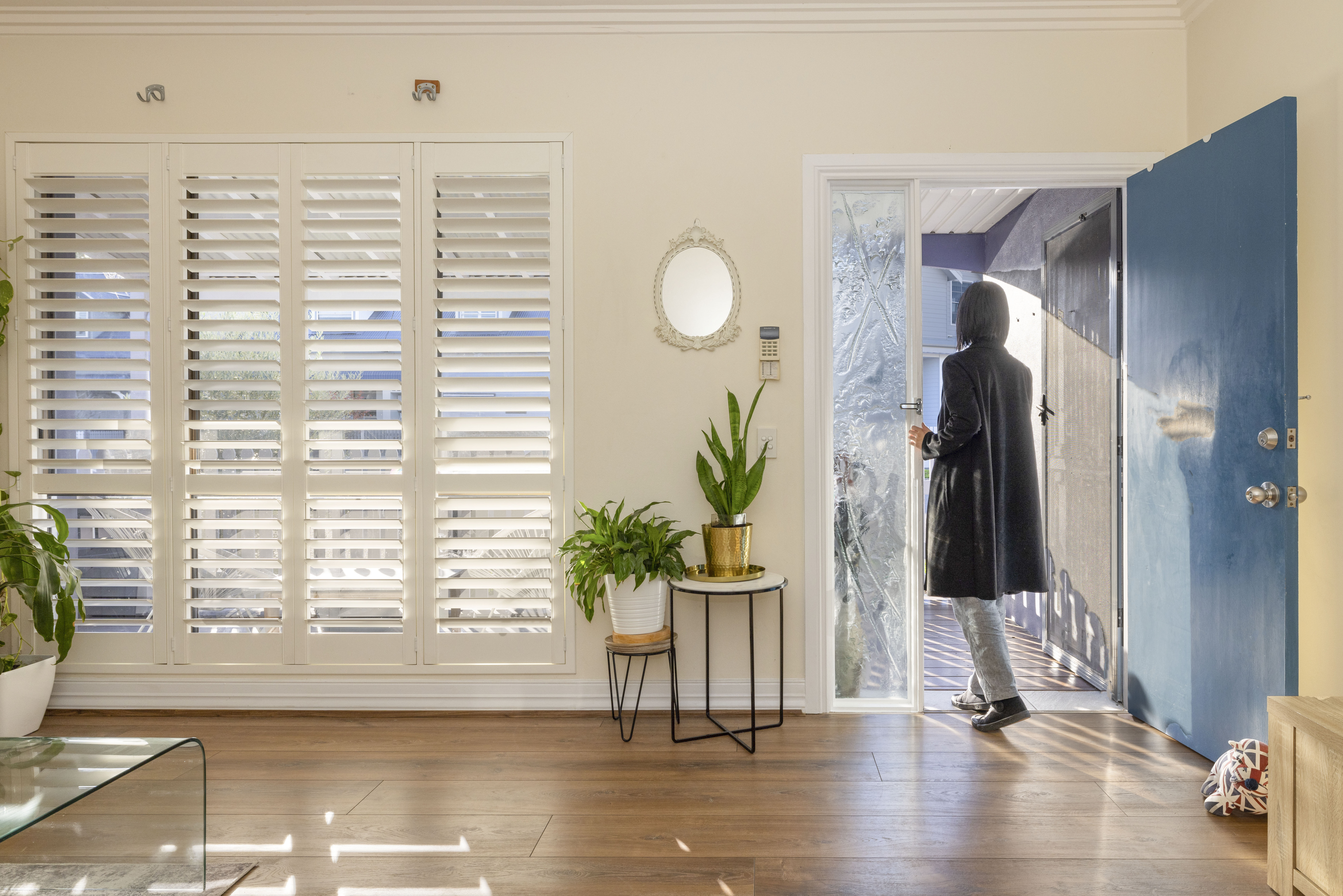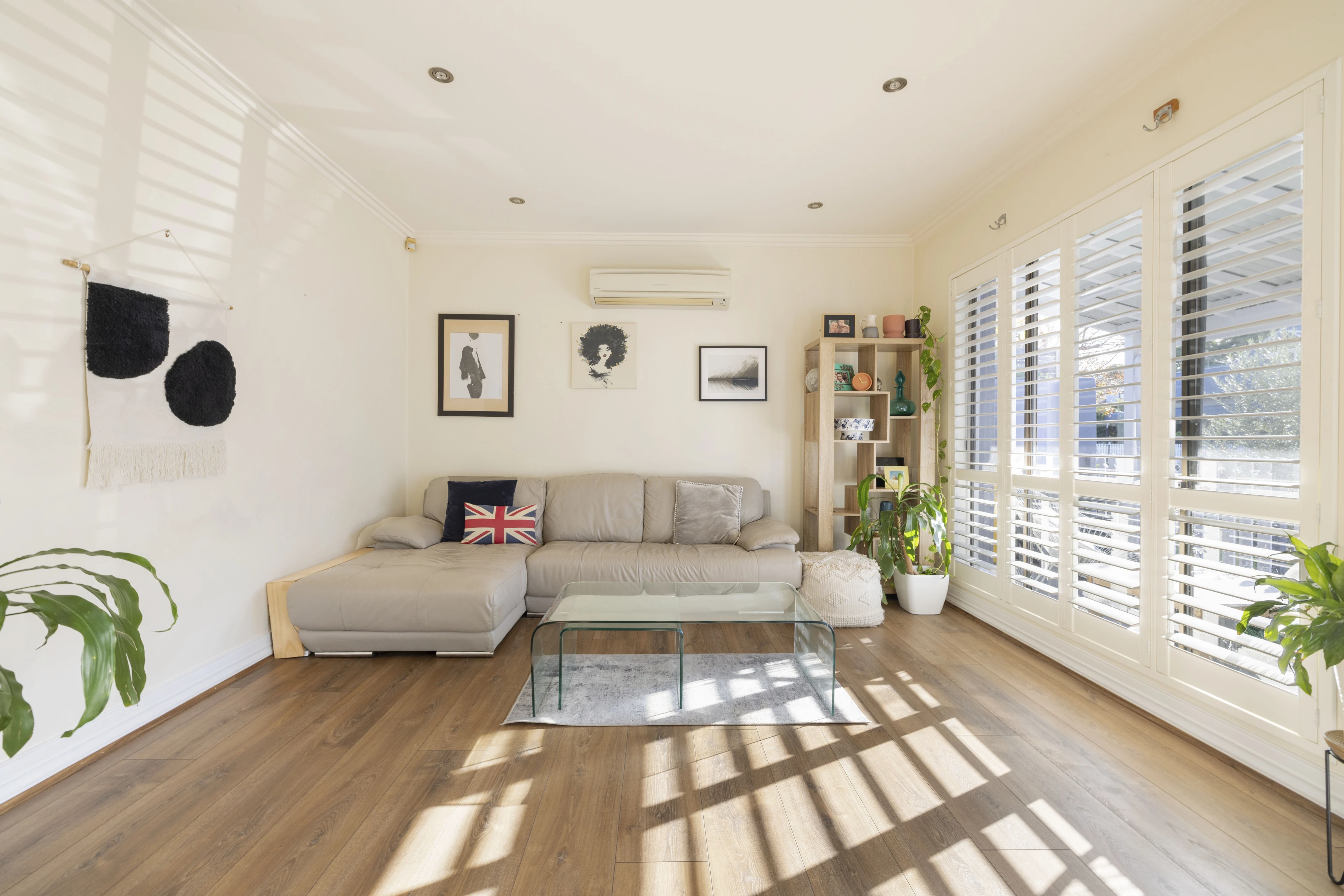 - Wood floors, plantation shutters, air con