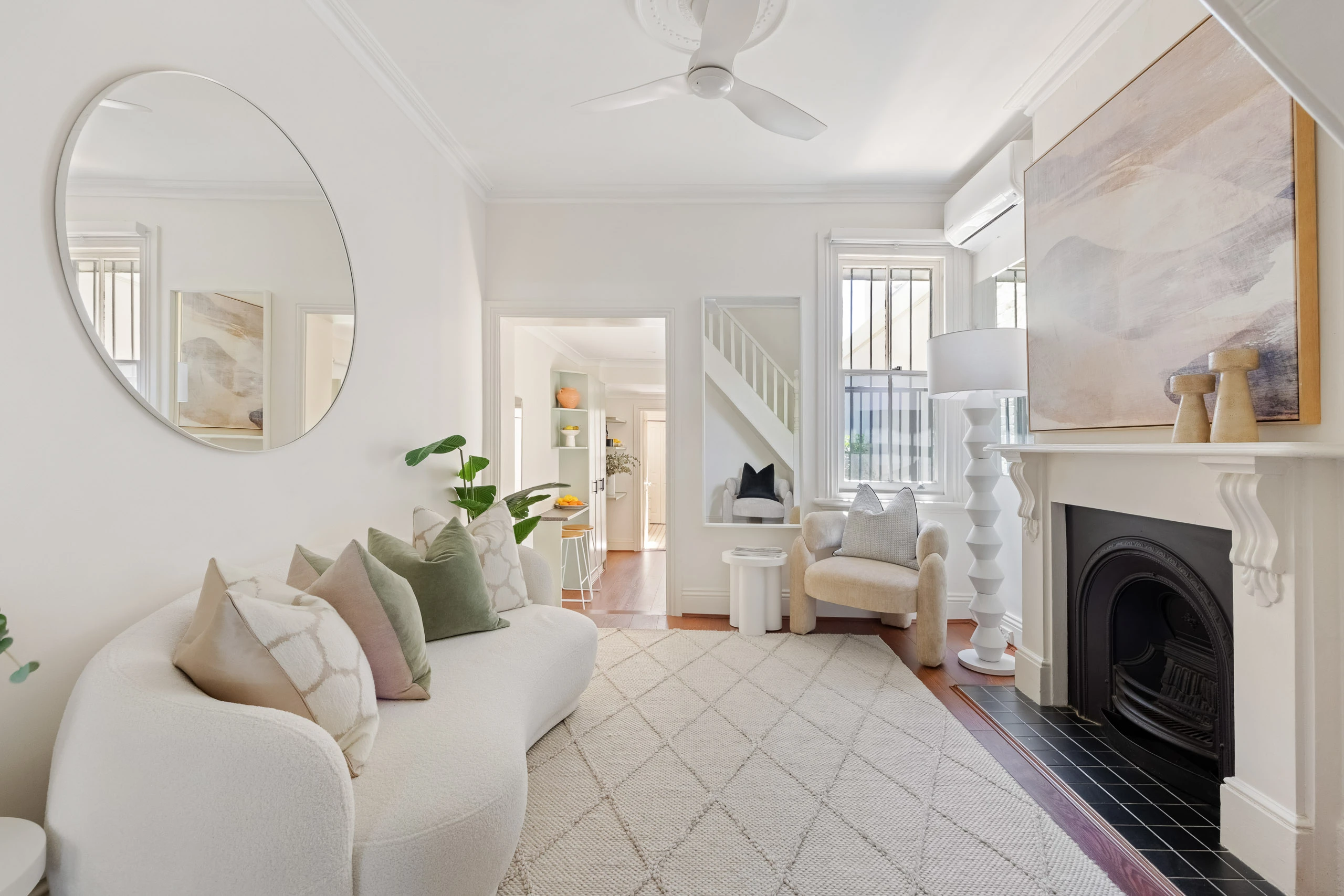 - Floorboards, 3 fireplaces, ornate high ceilings