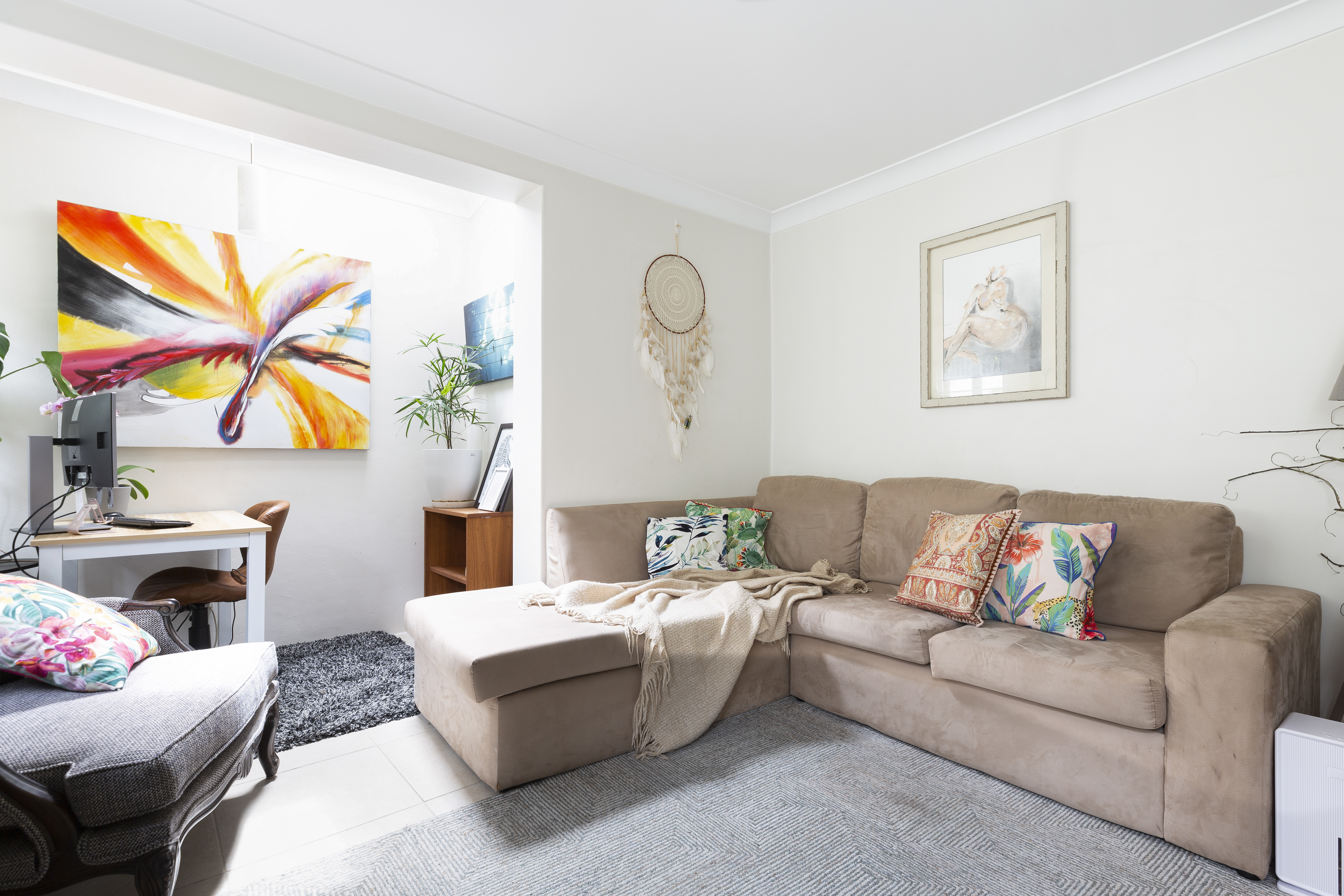 - Open living room with skylit study alcove