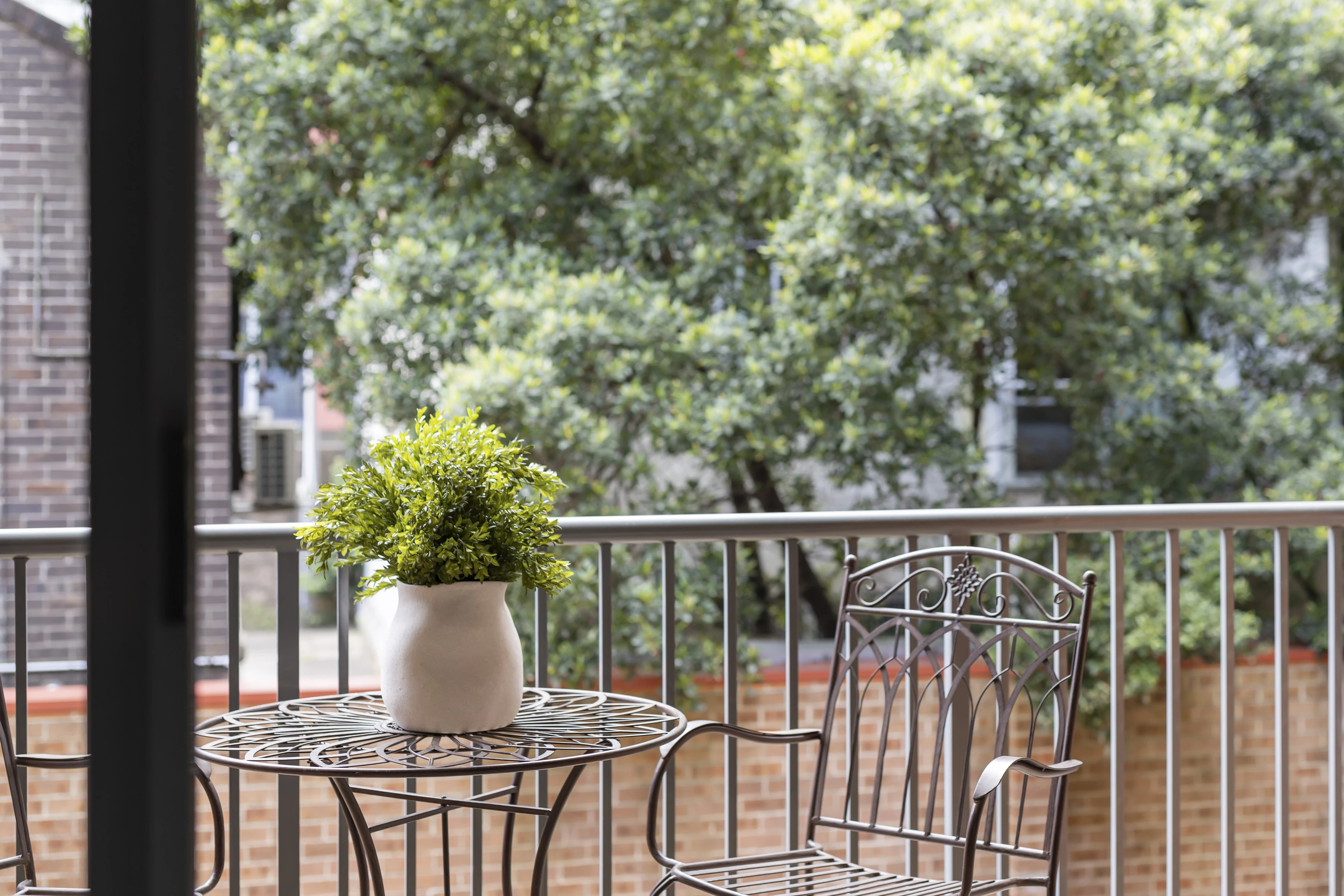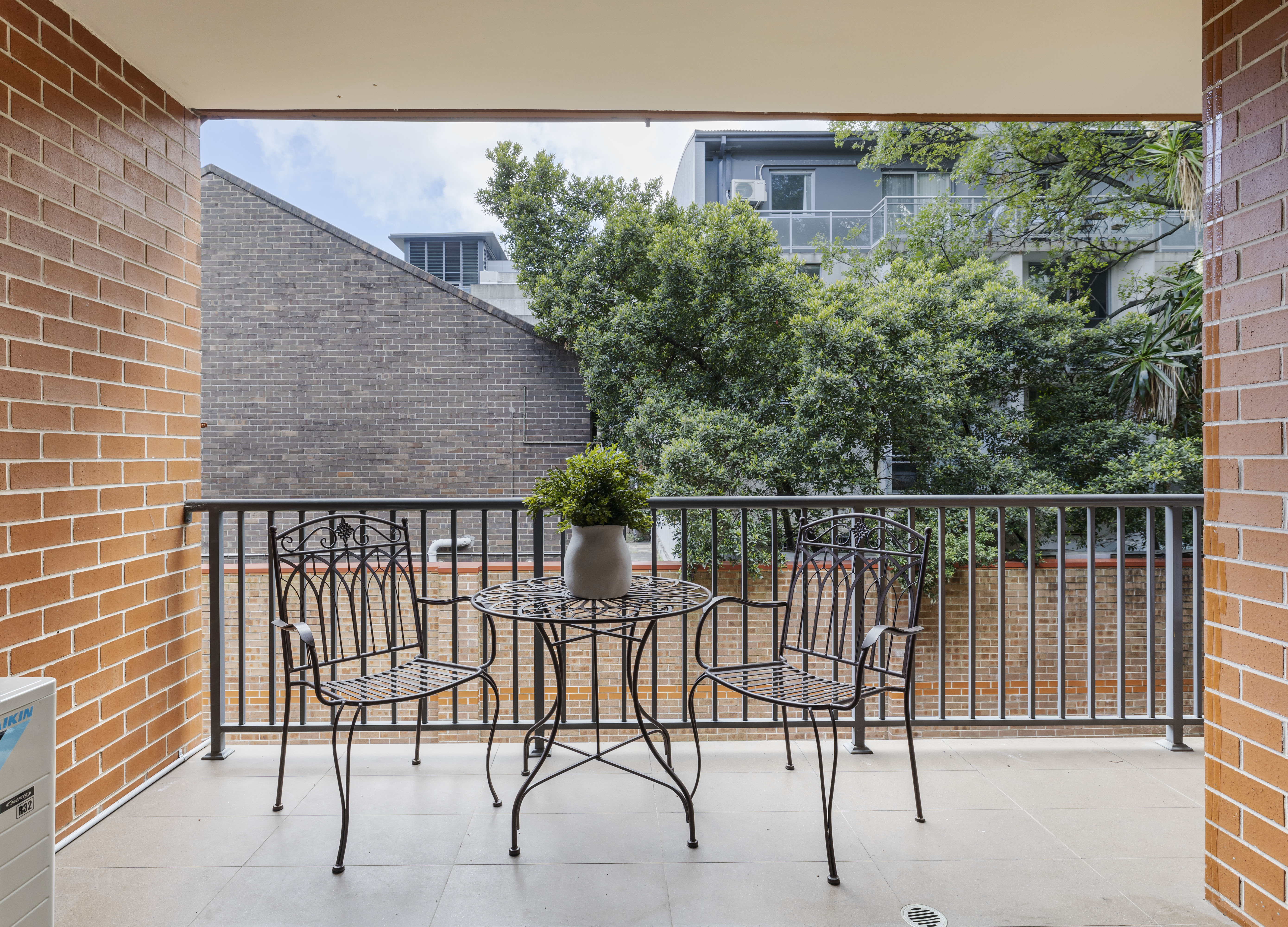 - Covered balcony, pretty leafy scenery