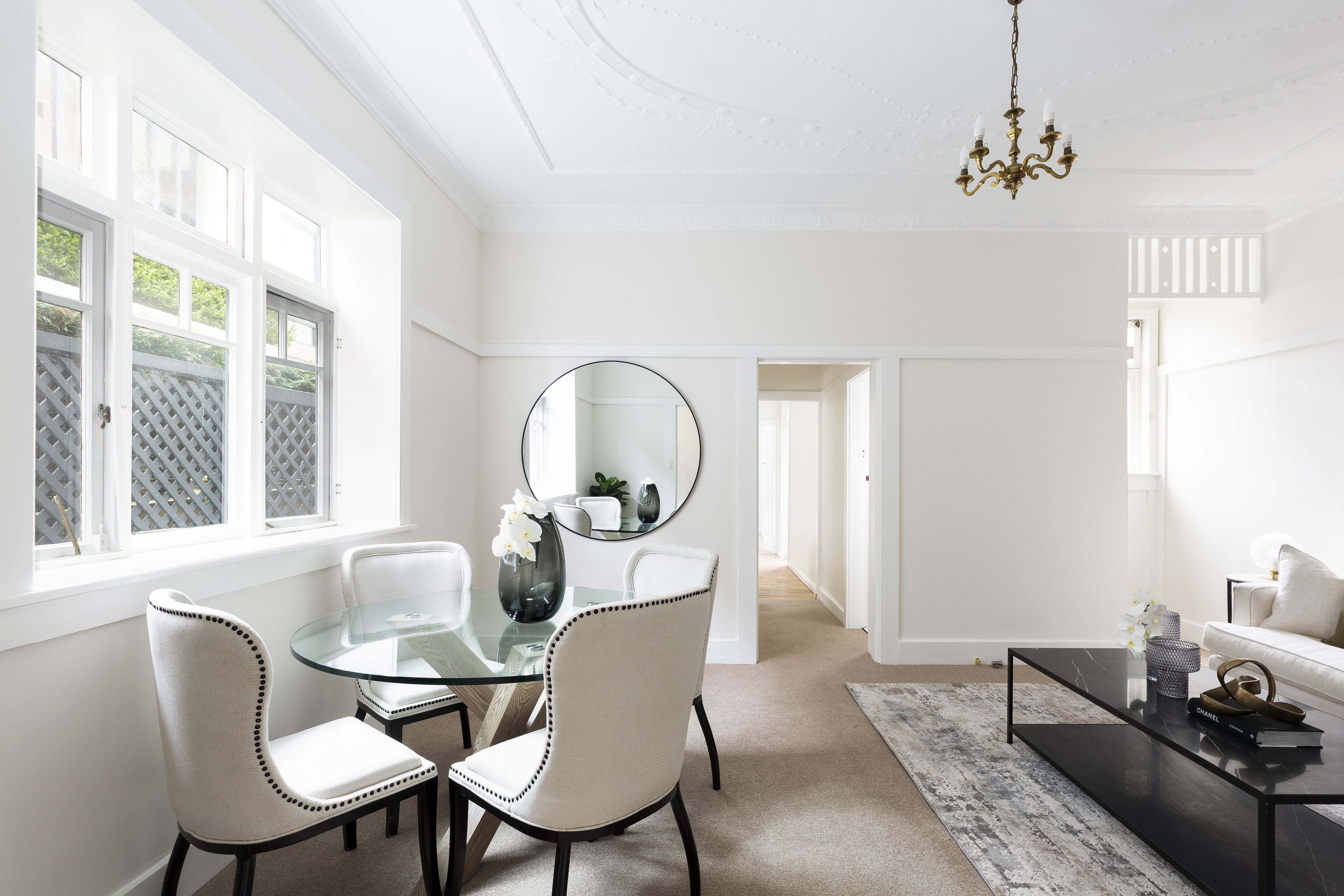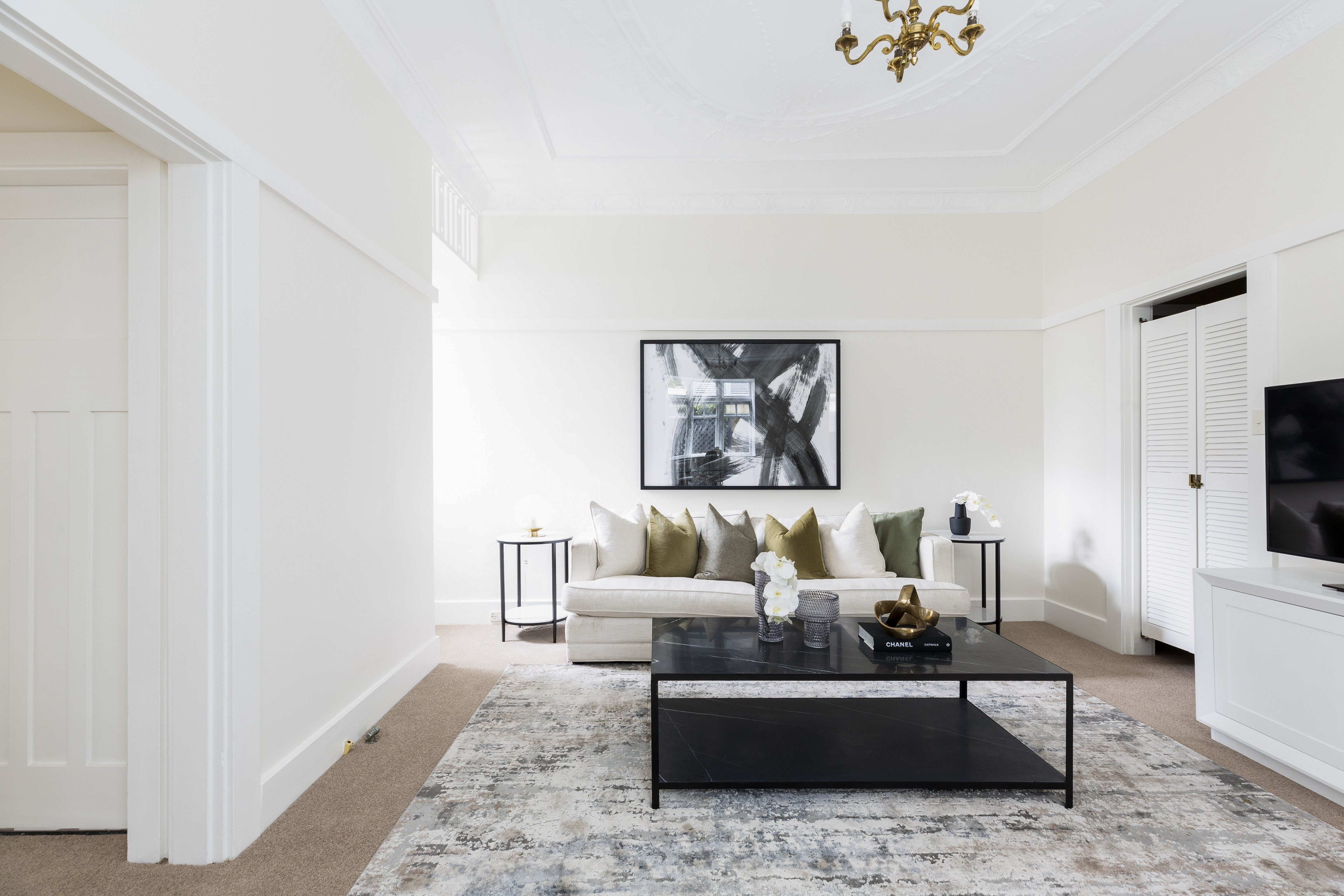 - High ceilings, decorative detailing