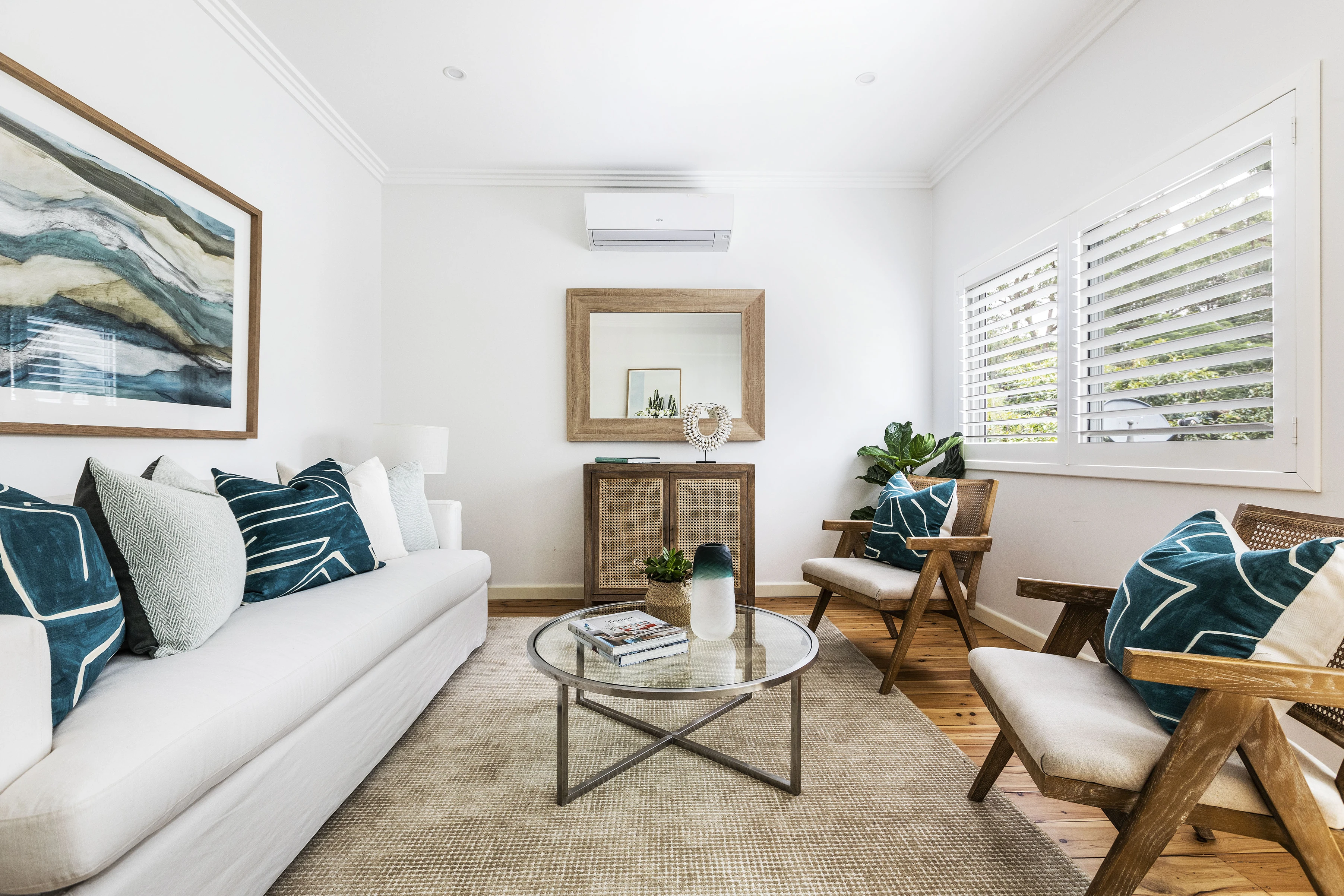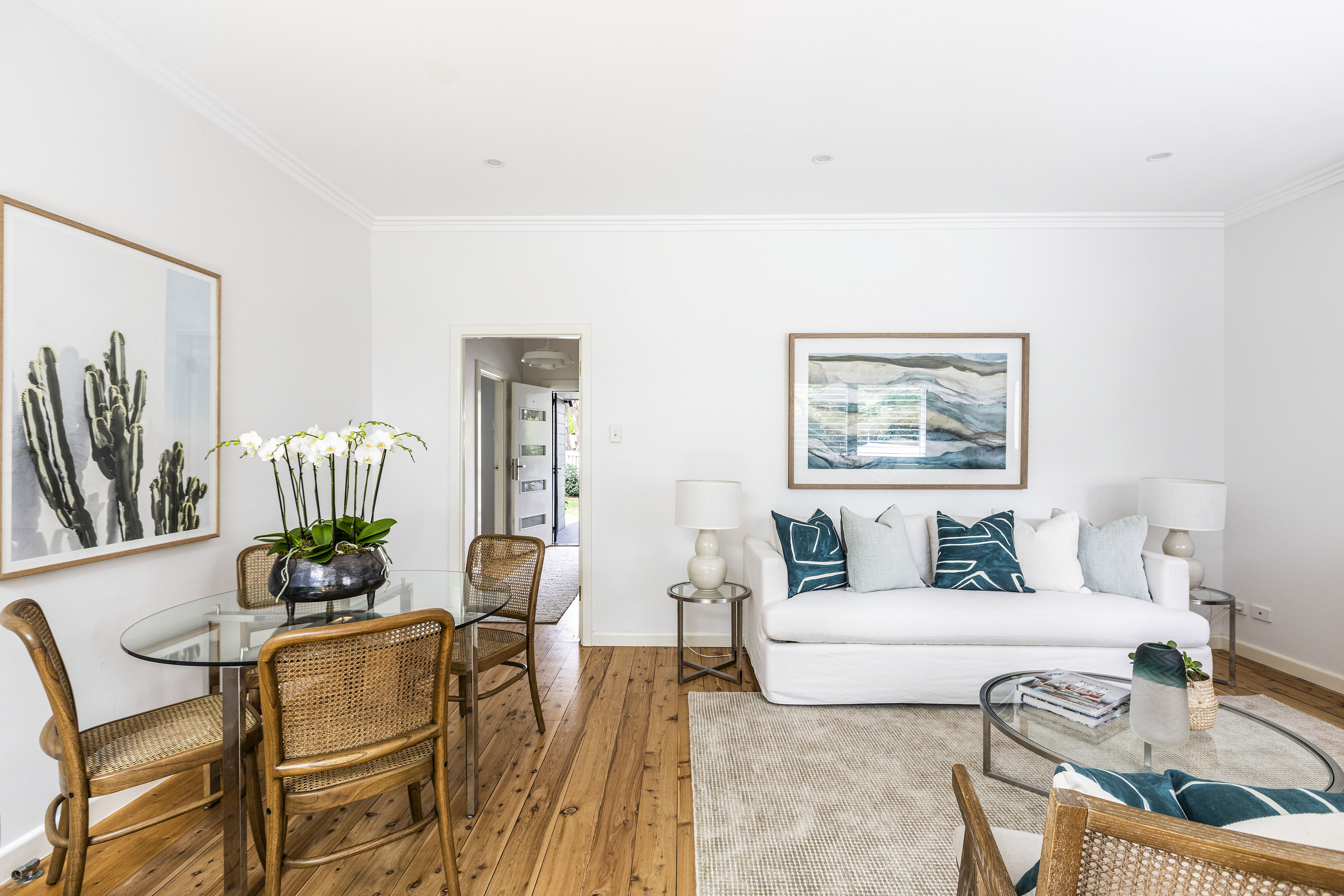 - Polished floorboards, overhead fans