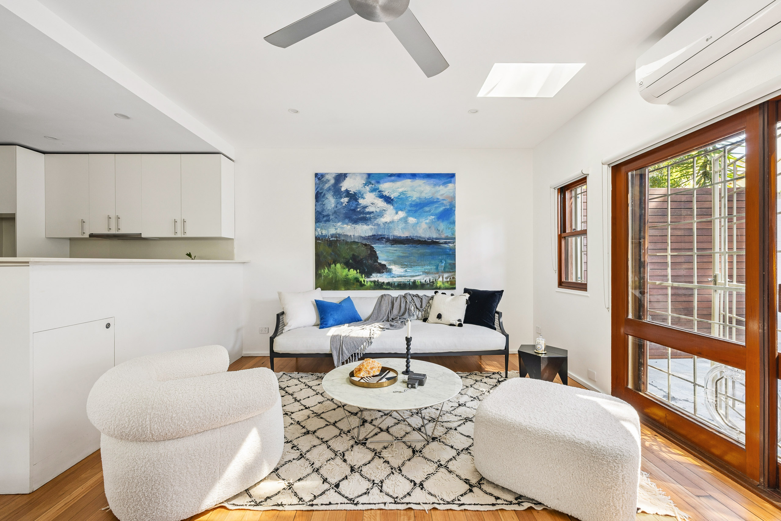 - Skylit open living, timber floors, air con