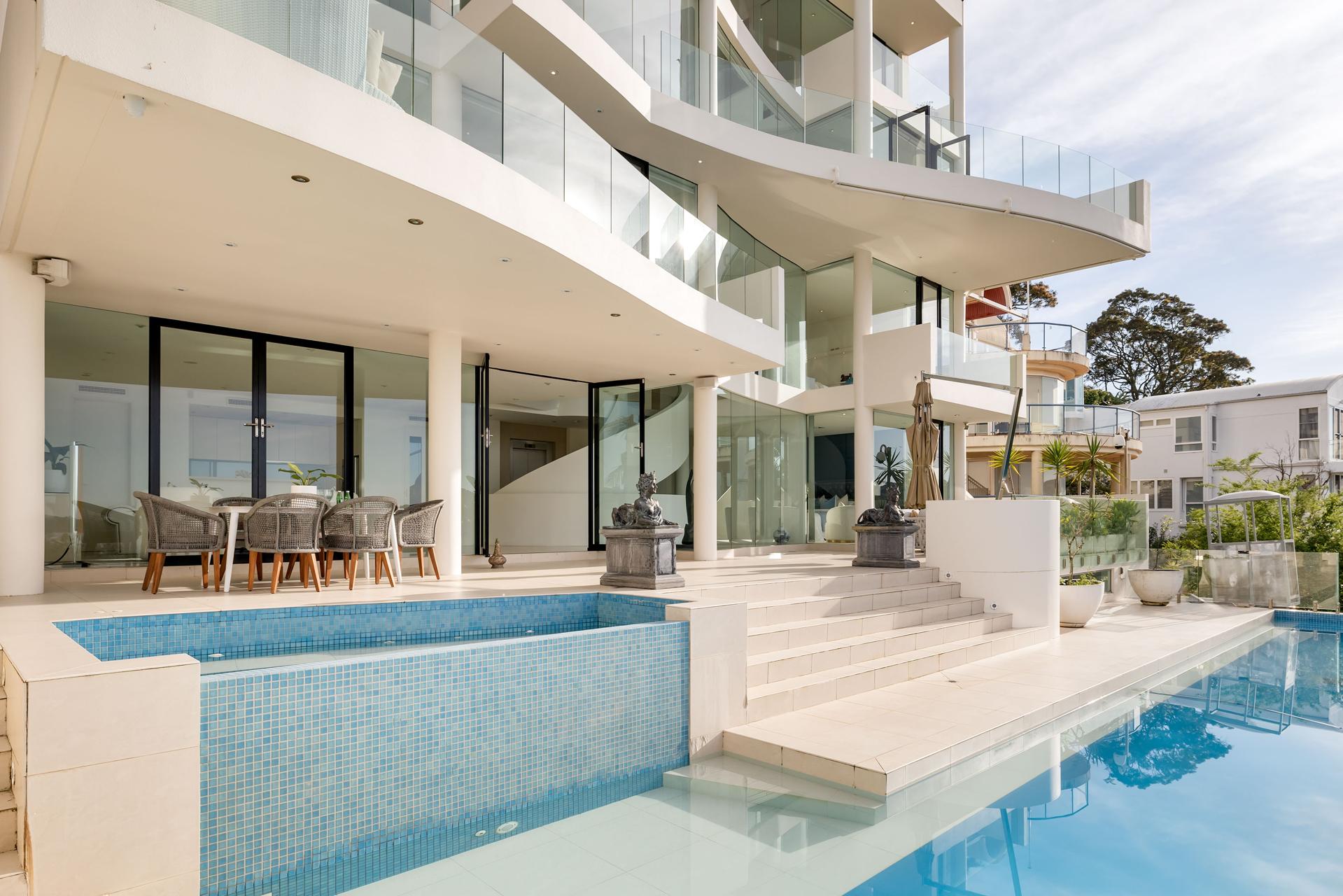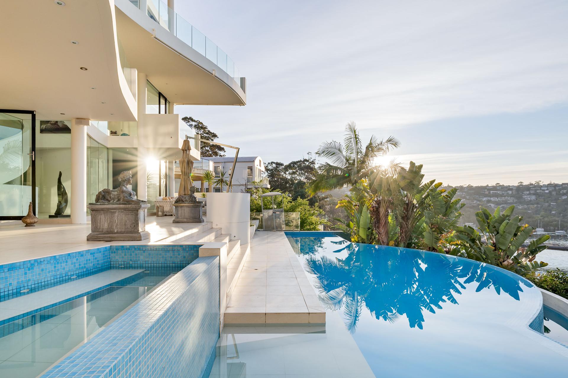 The ultimate waterfront trophy home with Middle Harbour views and two yacht berths, this residence is in a class of its own, a rarity that would be impossible to recreate under today’s construction parameters. A masterpiece 15 years in the making, originally conceived by the visionary architect Ralph Cunningham FRAIA. With five levels embracing a Sydney Harbour cliff face, it’s defined by signature curves, a striking sculptural staircase, and luxurious infinity pool setting, comprising around 1600sqm of indoor/outdoor living space. With all bedrooms designed with private ensuites and water-facing aspects, it invites you to take in the marine activity over the Spit to the marina opposite, and views to the ocean, for ever-changing scenes both day and night. Further connecting with the surrounds, a covered inclinator transports guests to the Japanese garden, and on to the jetty below. Offering a unique experience like nothing else, in a home of incredible scale, high-spec finishes, multiple wings for residents and guests, and waterfront facilities.
