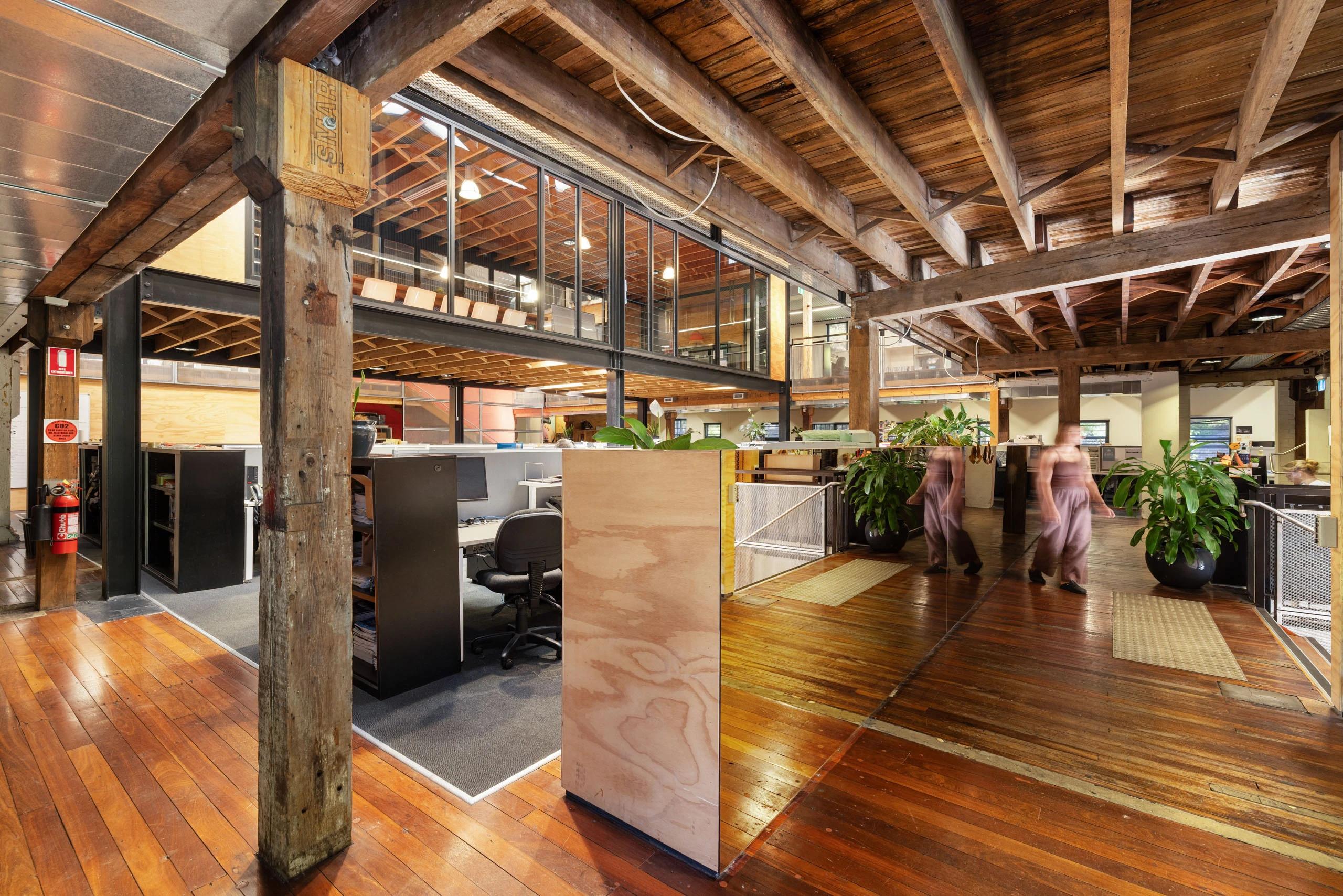 - Exposed timber beams, industrial detailing