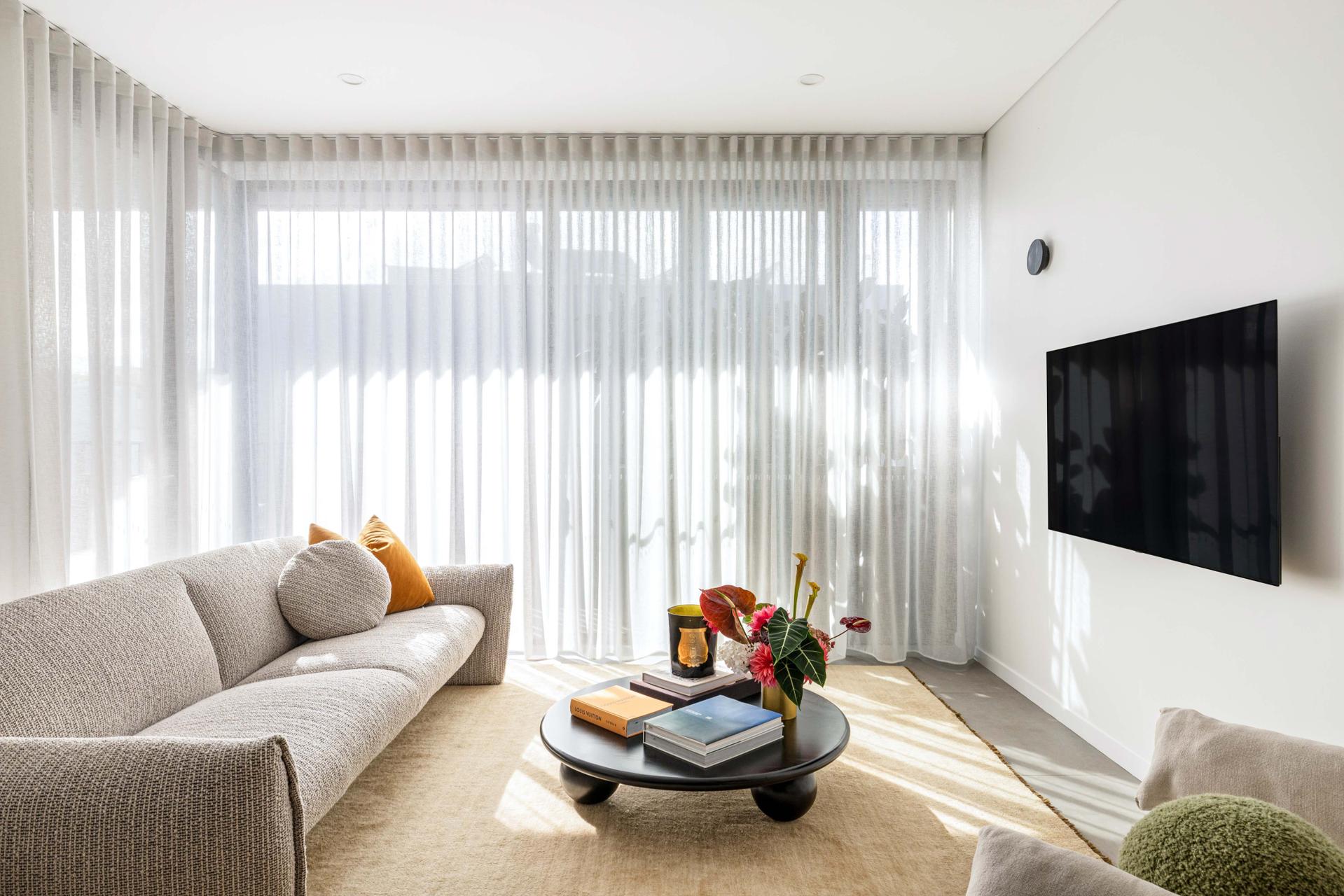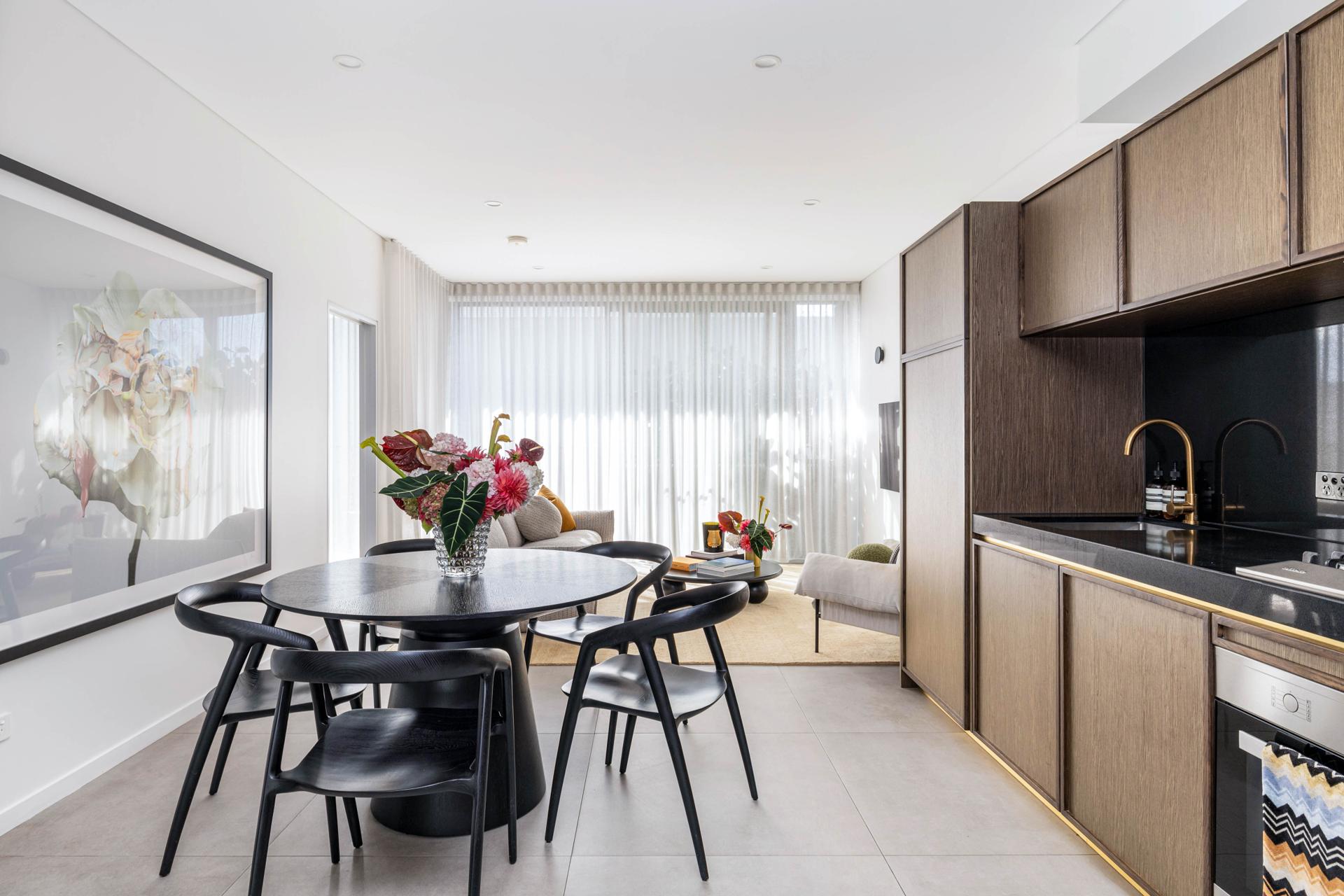 - Cohesive timber, brass and stone finishes