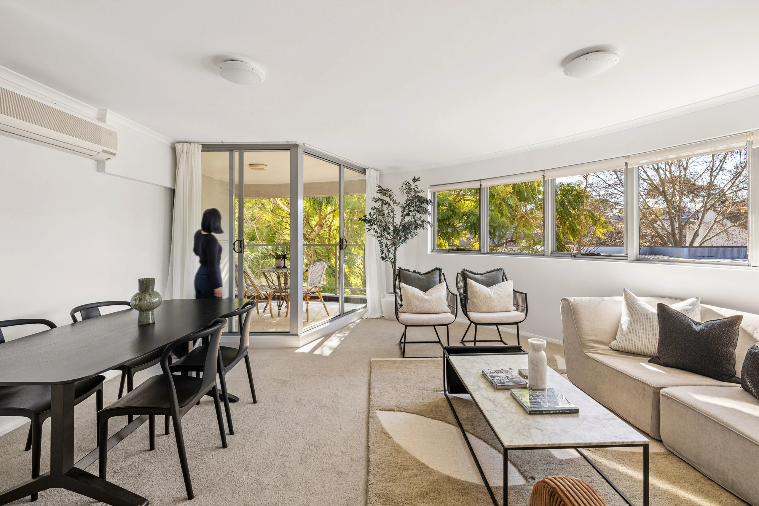 - Flows to a balcony with treetop views