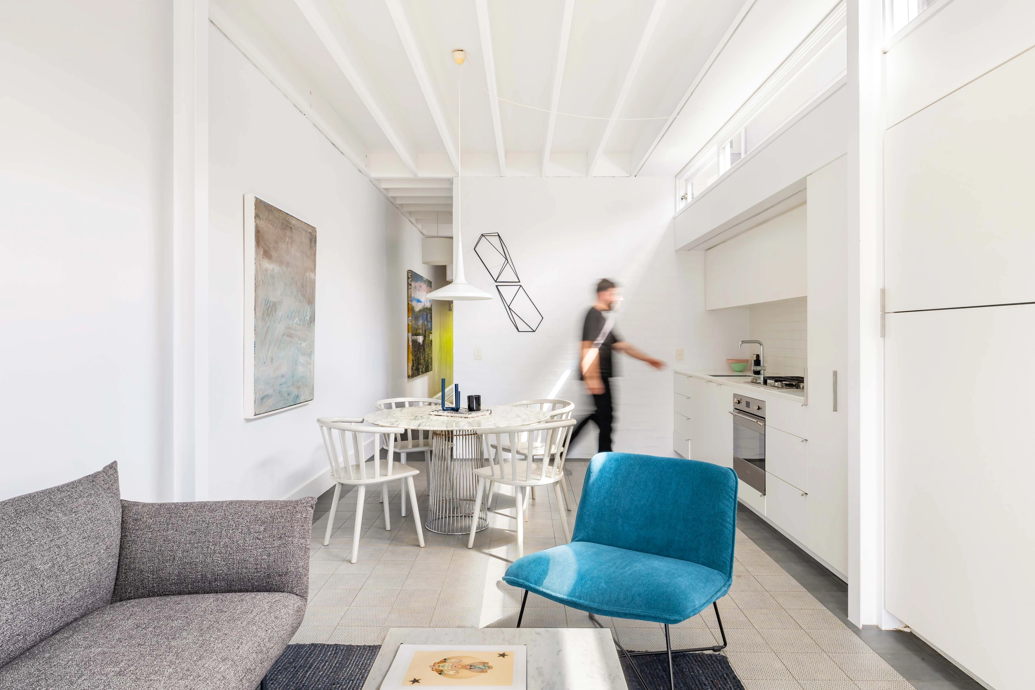 - All-white aesthetic with integrated joinery