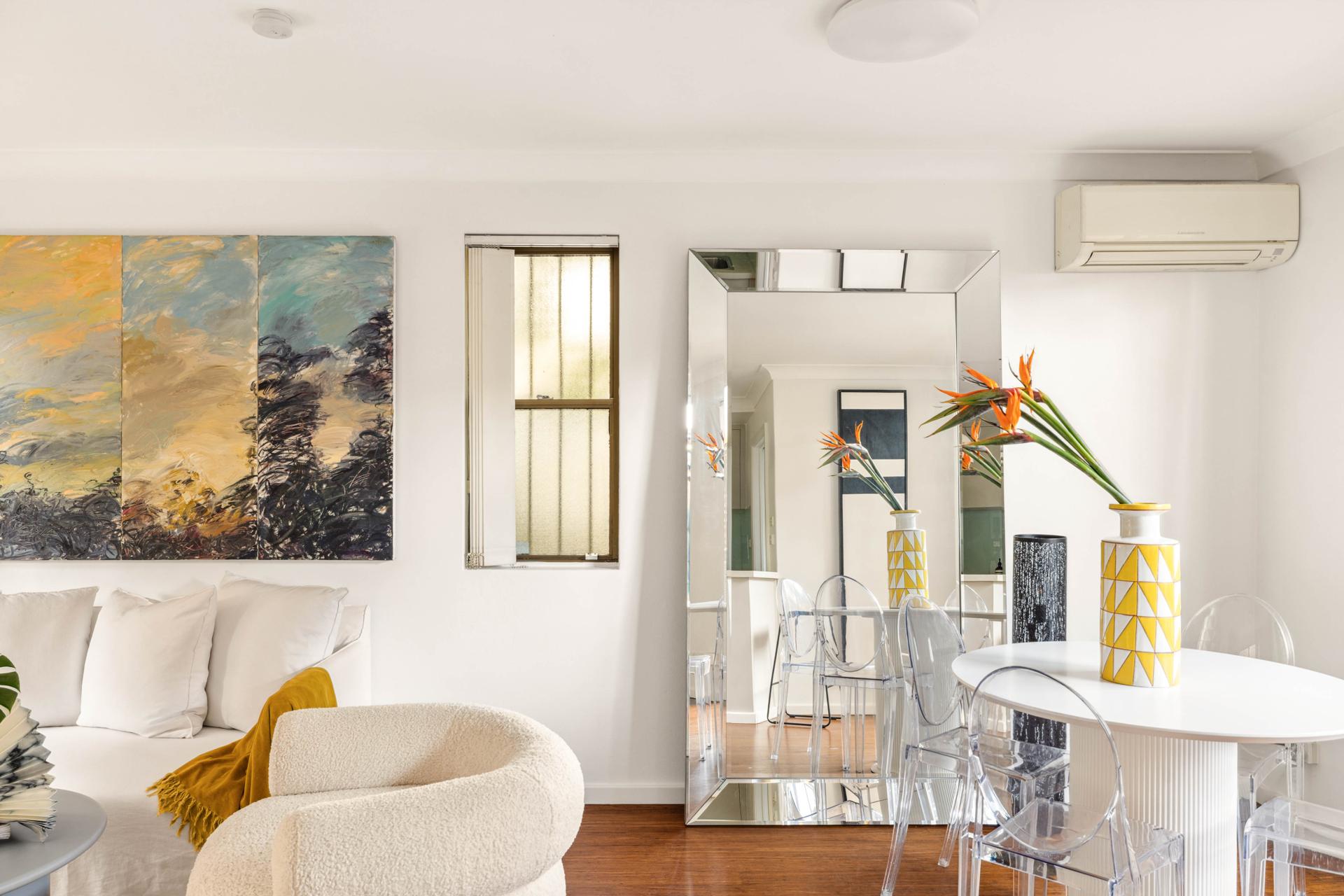 - Open living, polished floorboards, air con