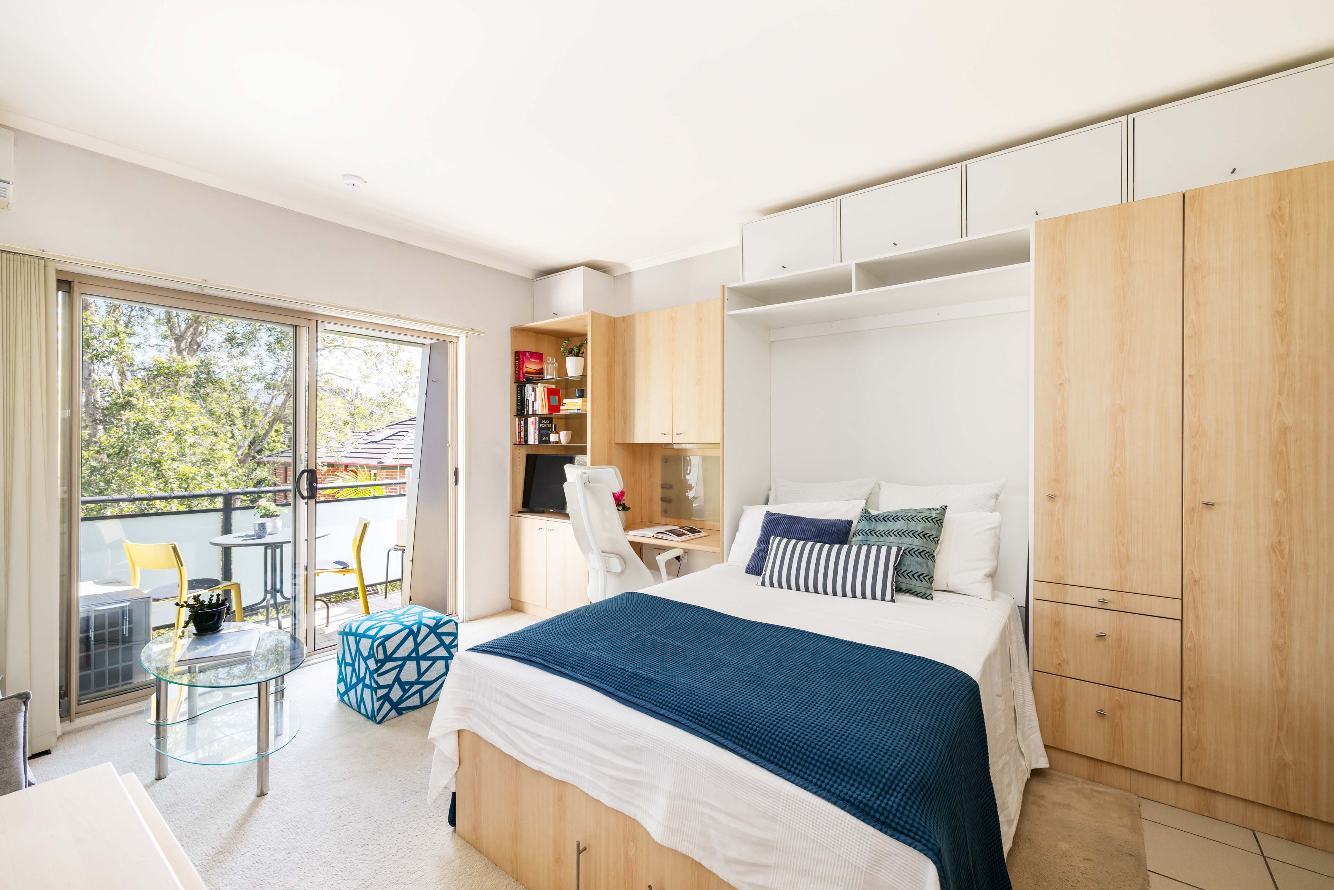 - Foldaway bed, shelving, desk, wardrobes