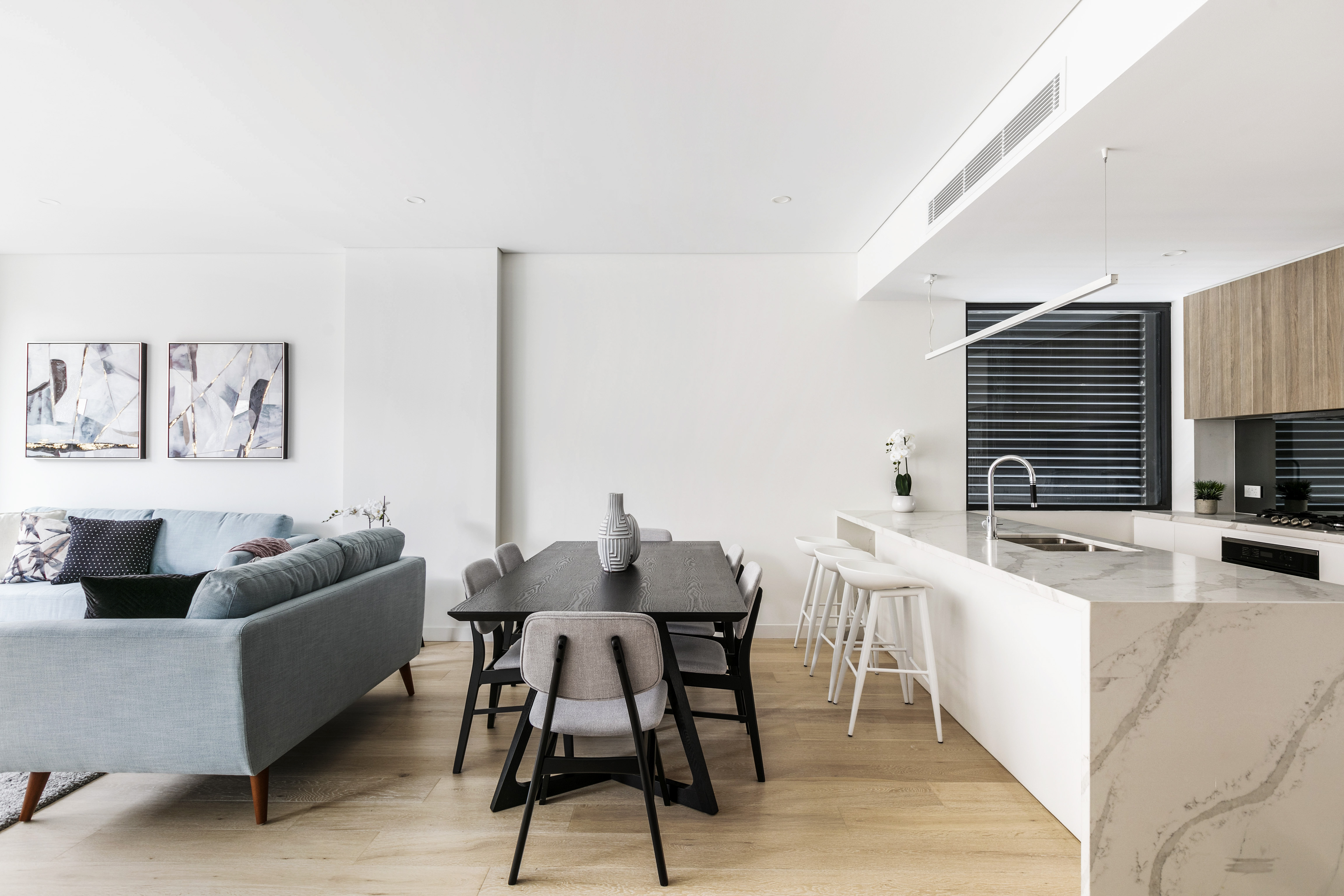 - Full laundry, marble-detailed bathrooms