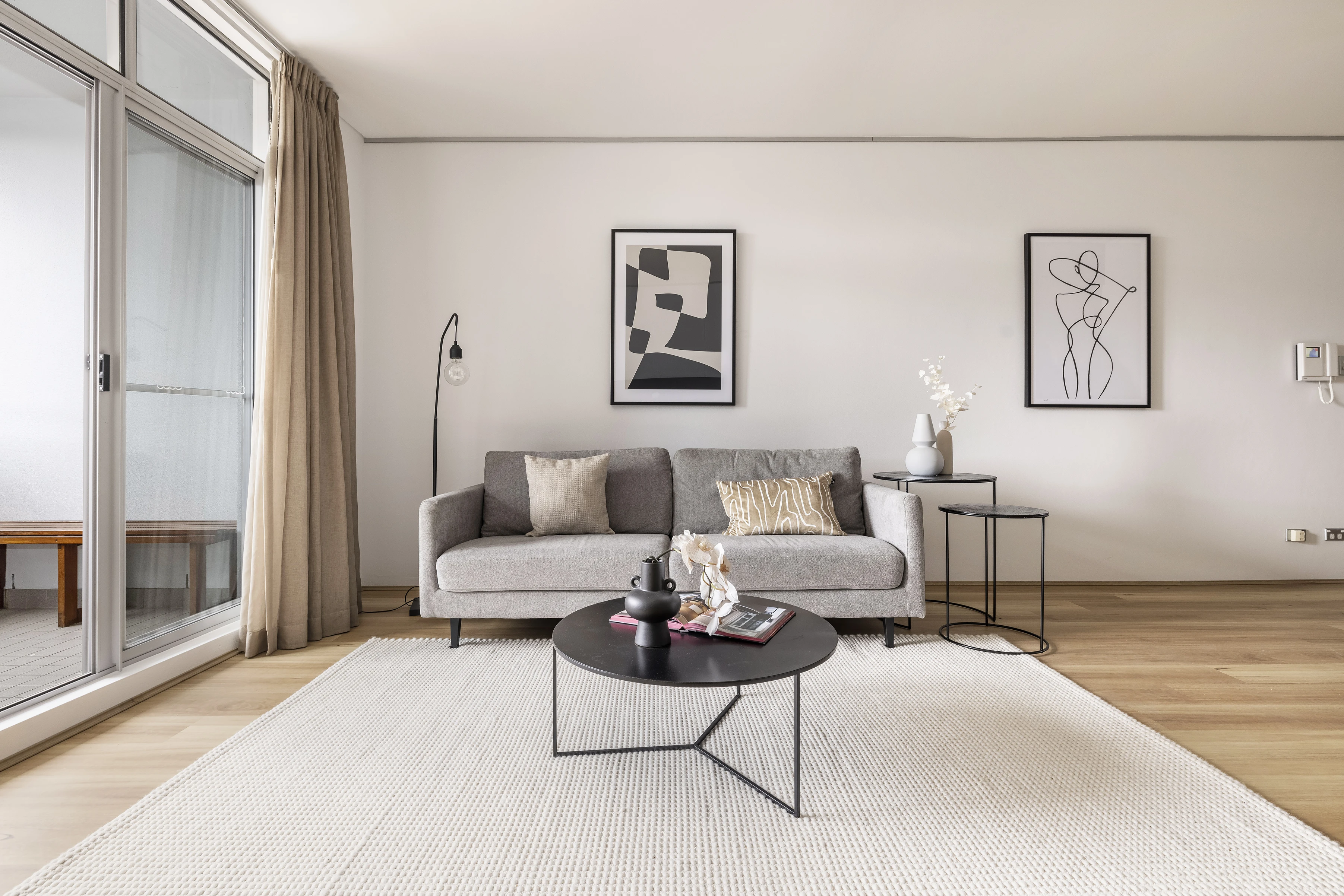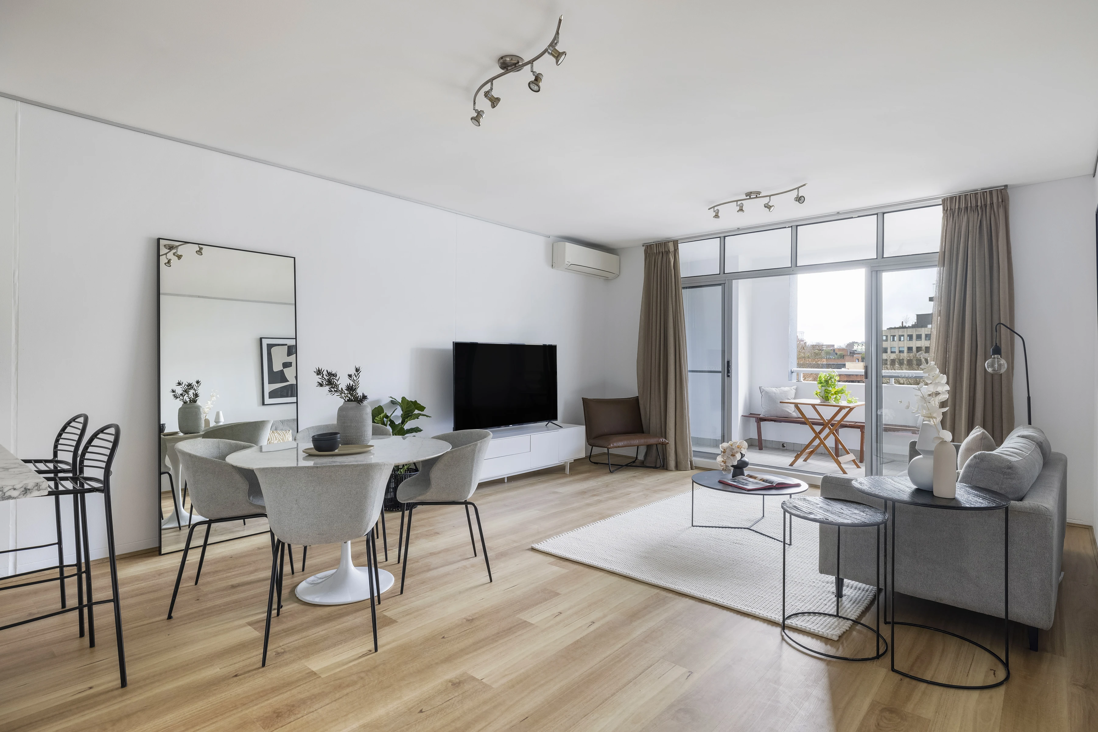 - Timber boards, floor-to-ceiling glass