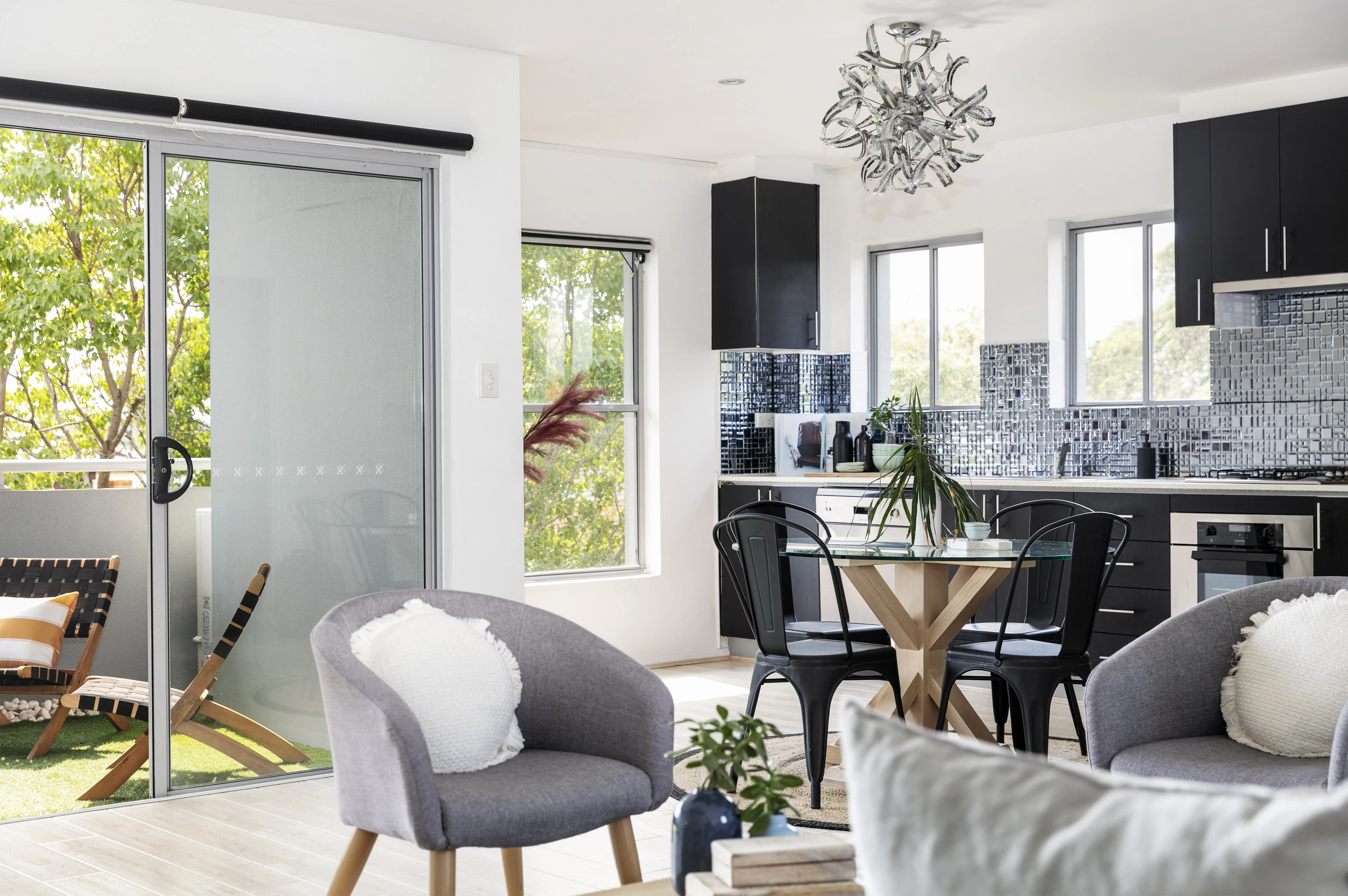- Wall-to-wall glass opening to balcony