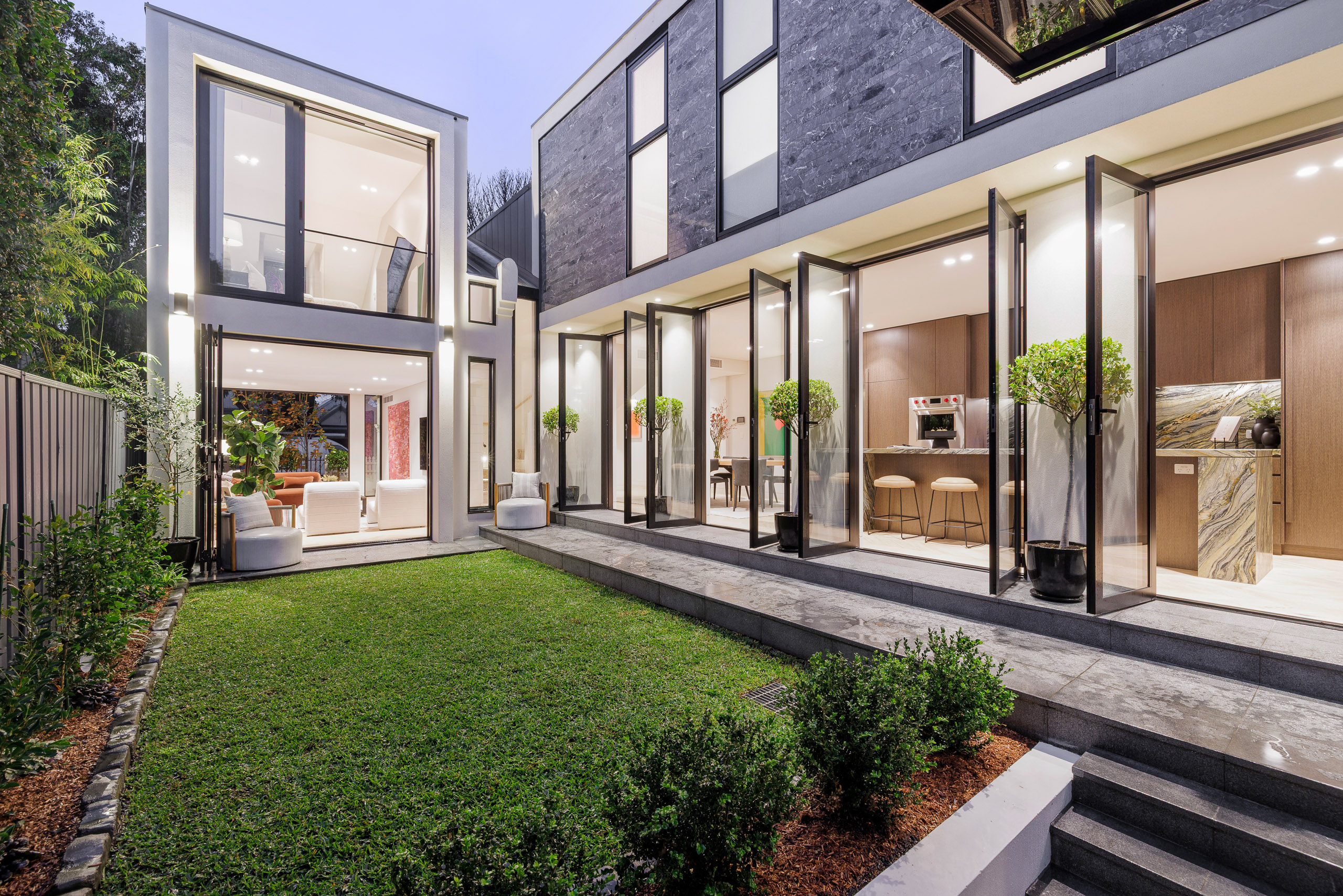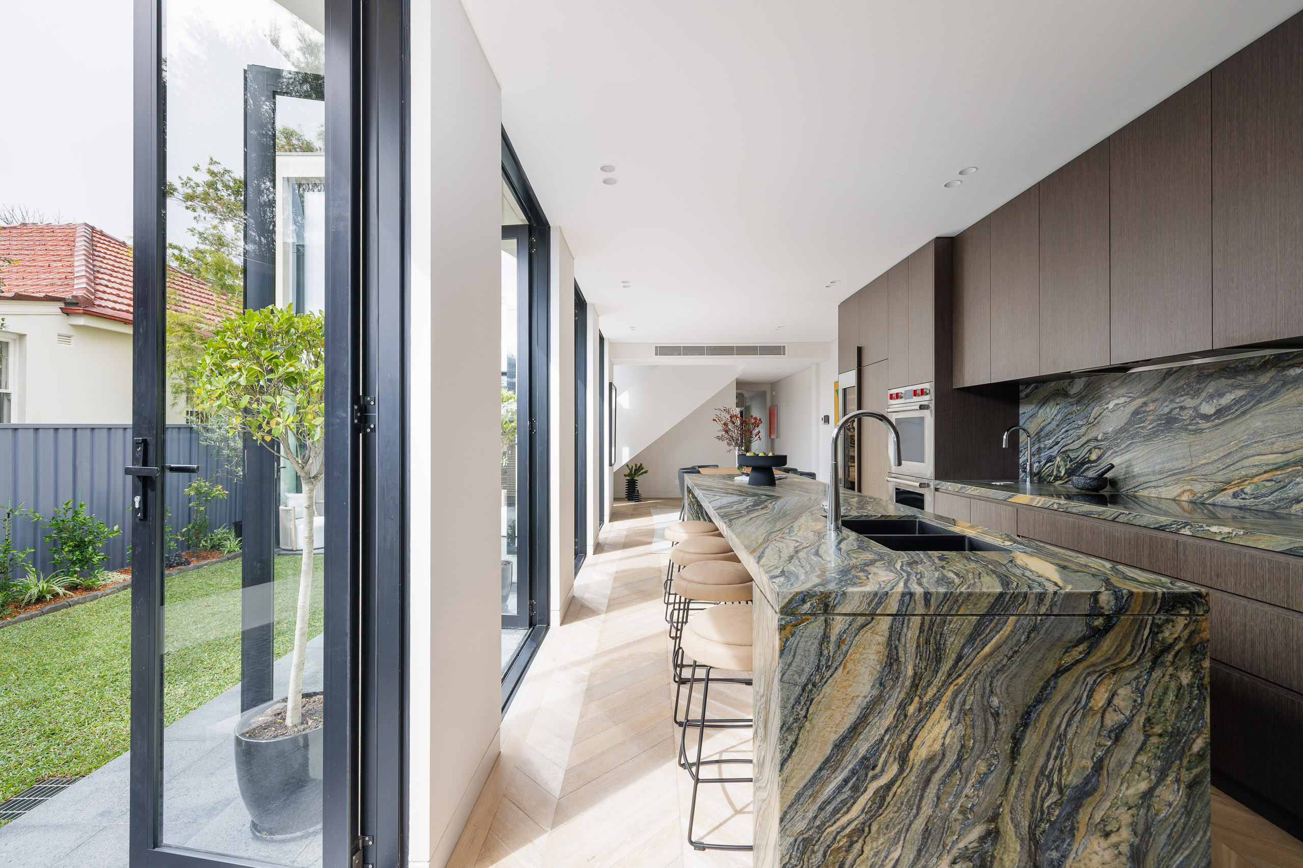 An exceptional opportunity in Alexandria’s prestigious ‘golden triangle’ setting: a rare 221sqm double-width block, offered for the first time in 121 years. Redeveloped as an architectural showpiece that sits as harmoniously in its streetscape as it did in 1890. The home has been masterfully crafted and appointed with finishes and inclusions of the highest standard. For optimal privacy and seamless connection, the design is oriented around an internal grassed yard, every room opening to or overseeing the chic manicured grounds. The open-plan kitchen/dining is lined in a row of 2.6m French doors that capture northerly sunlight and cast it across the parquetry oak floors. Meanwhile, the vast living pavilion opens to garden scenes on two sides. Upstairs, an oversized master wing includes a walk-in robe and double ensuite, plus a glass corridor linking the original terrace to the contemporary extension. A turnkey family home of utmost quality in the area’s foremost pocket, close to parks and playgrounds, local cafés and dining favourites, schools, and train and metro stations, with rapid access to the city.