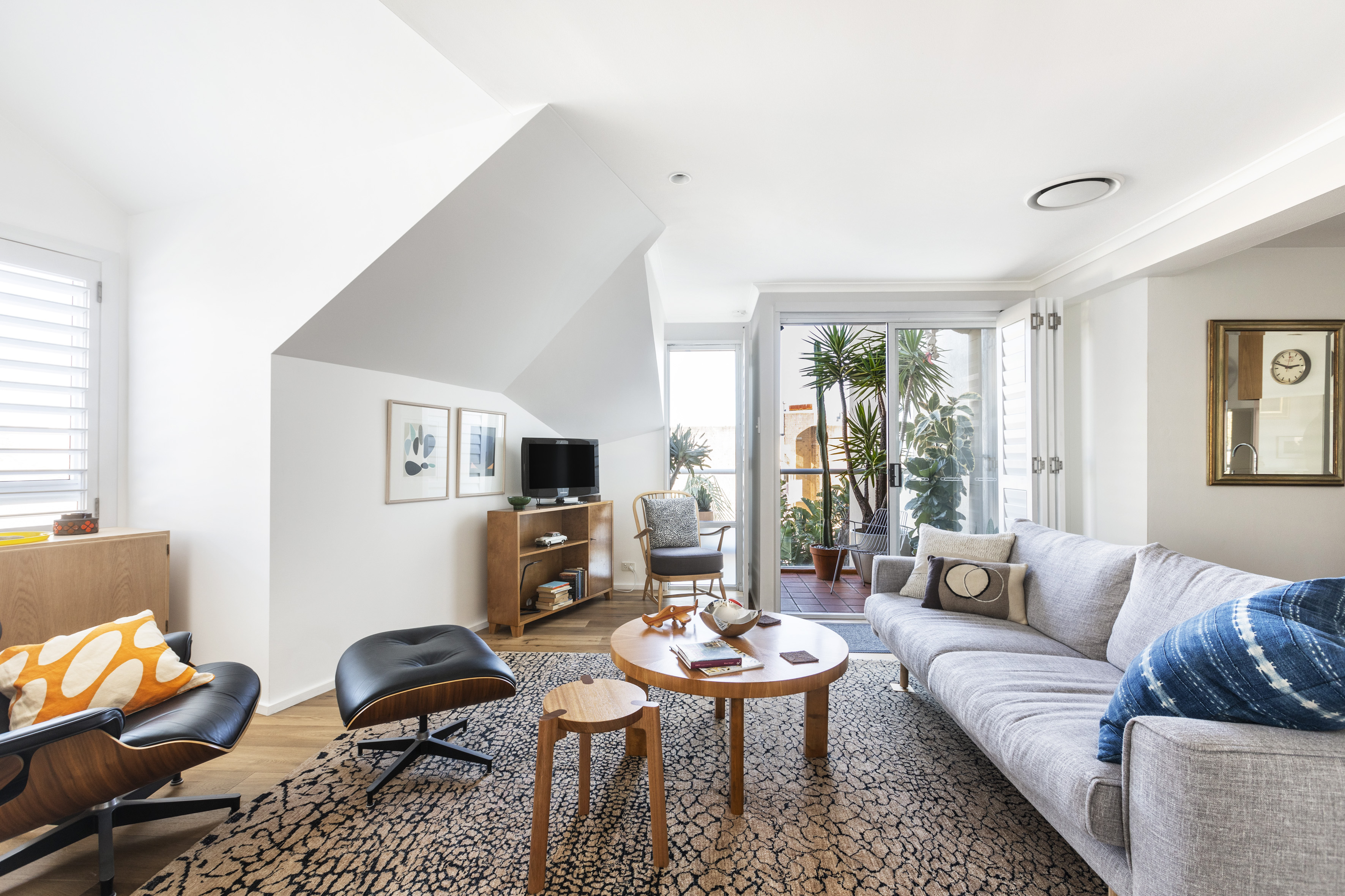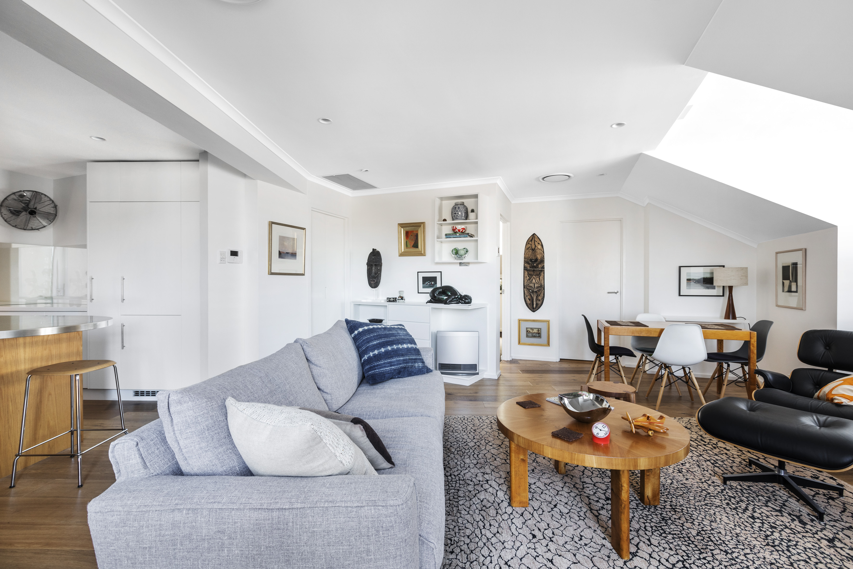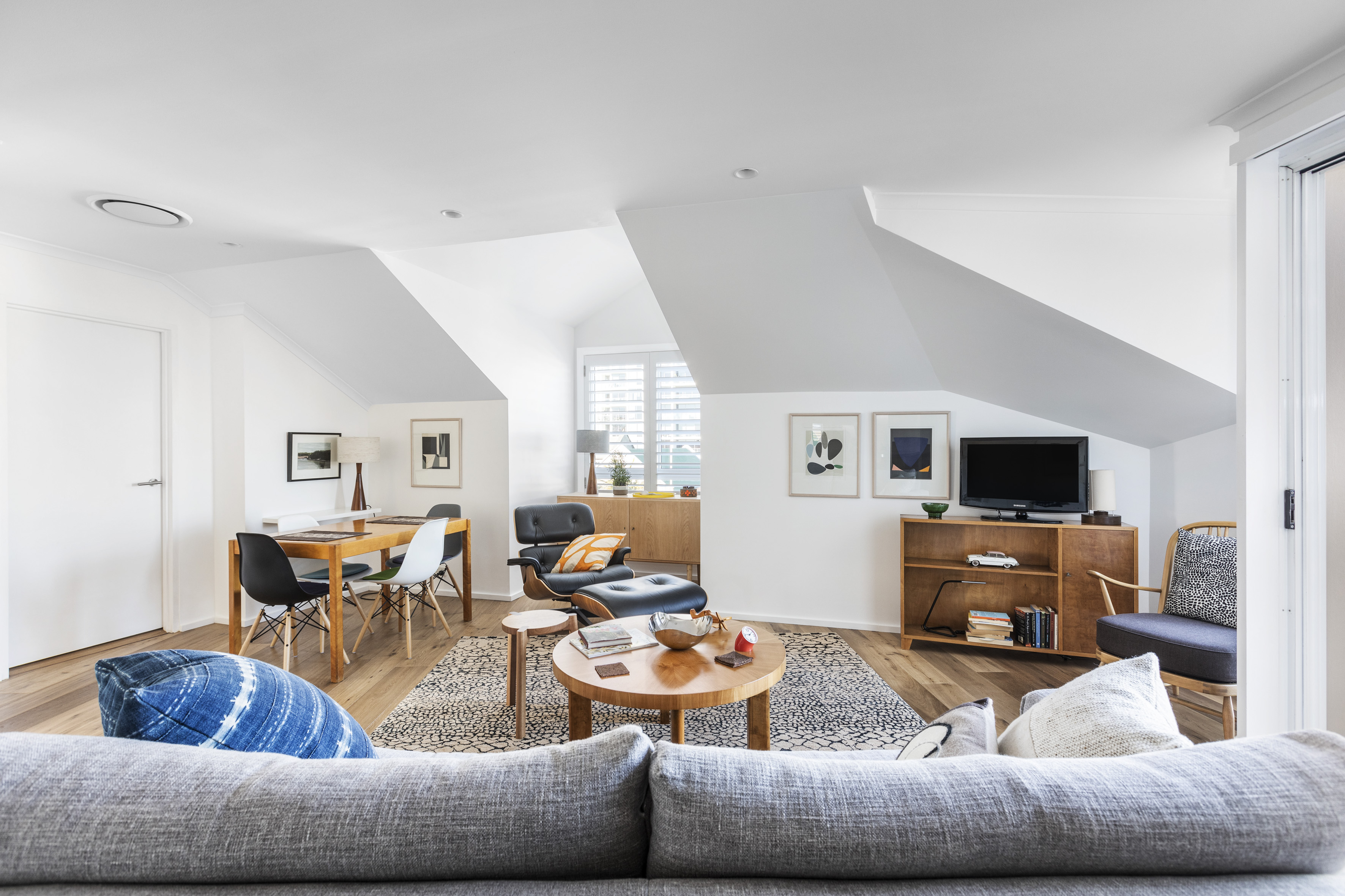 High-spec finishes and an angled ceiling bring a sophisticated sky-house ambience to this apartment. On the edge of Taylor Square, everything is at your door, yet it feels far away from up here.