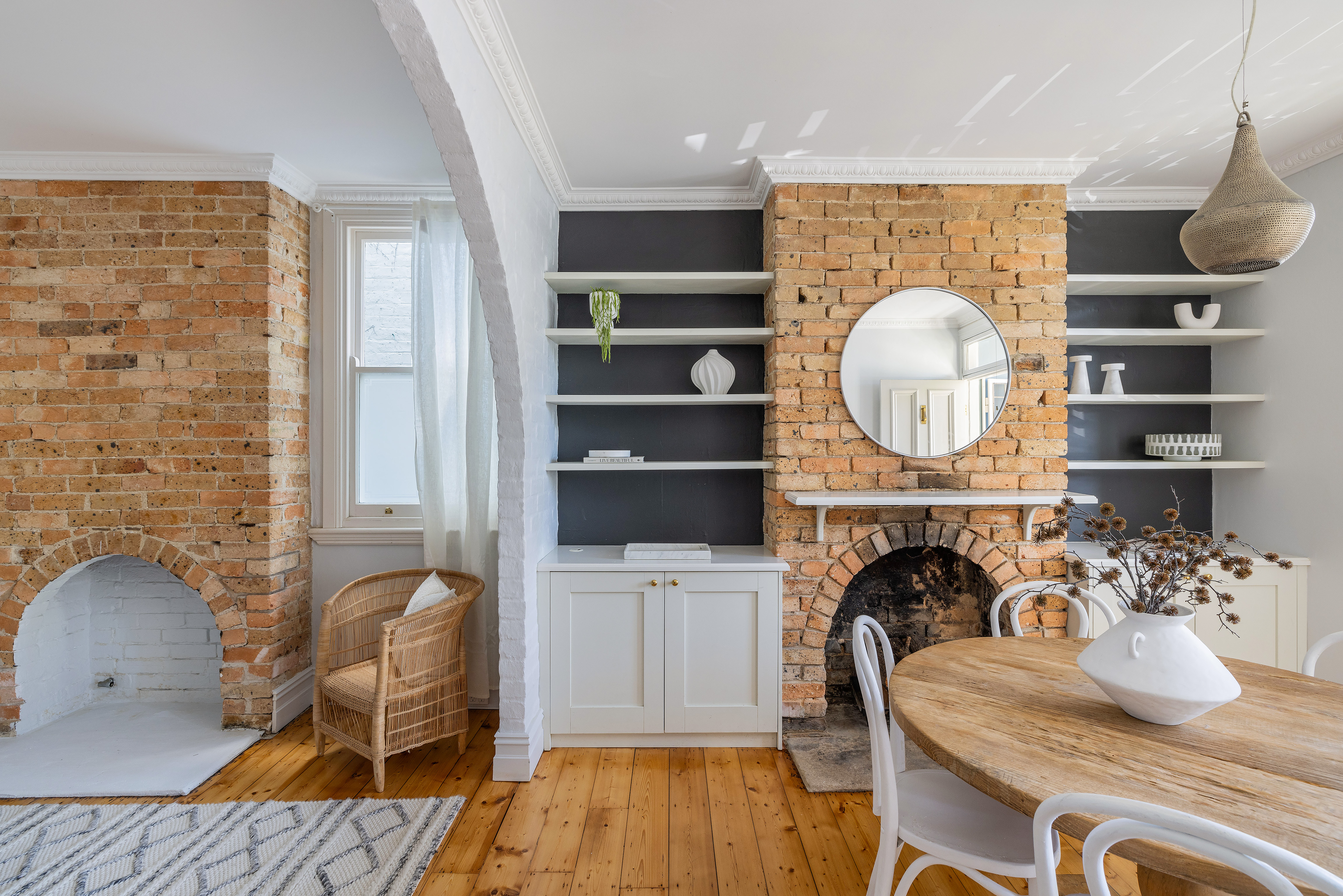 - Exposed brick, custom joinery/storage