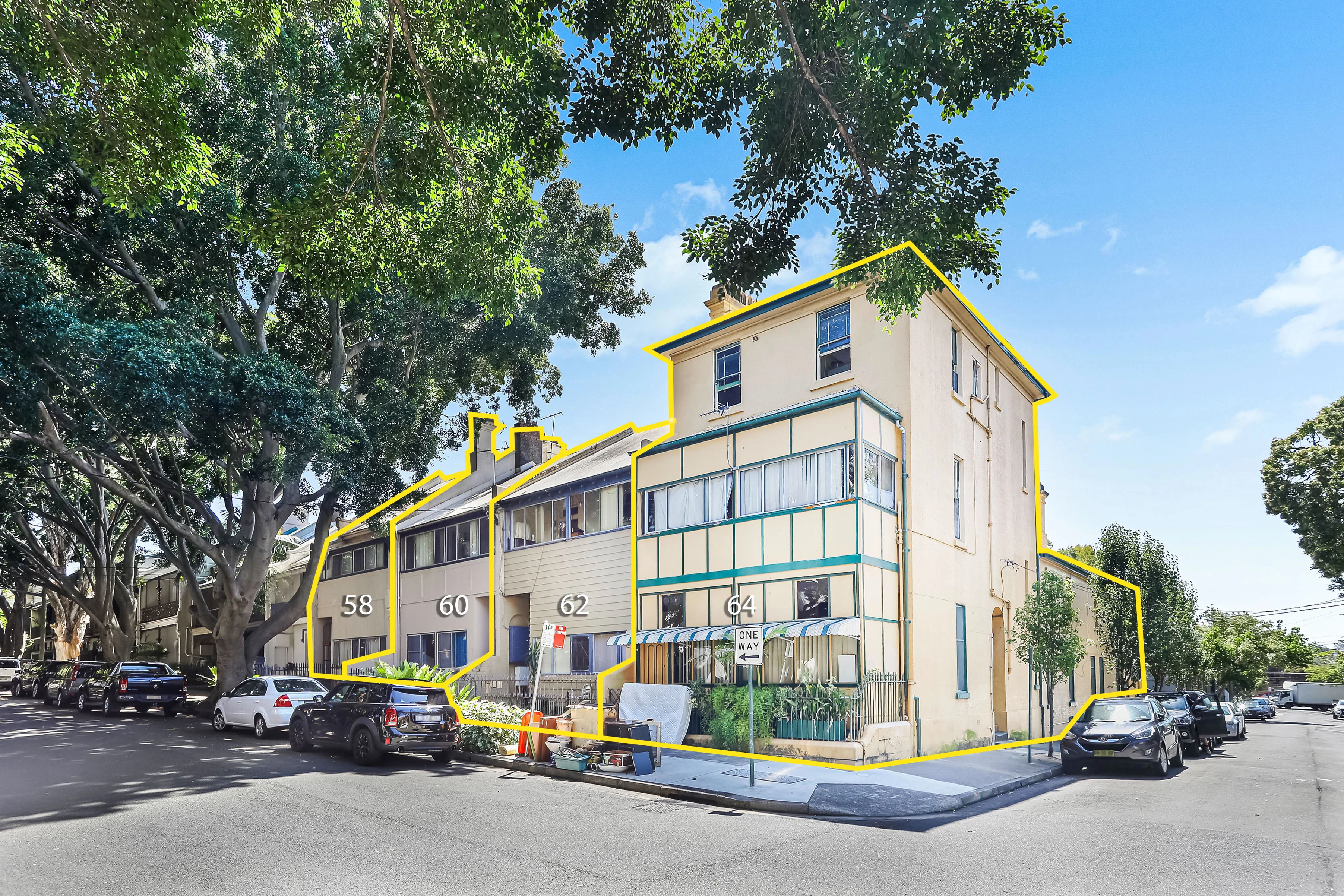 4 giant early century terraces, each 6.5 metres wide each offered in one line. One of Paddington's last significant, undeveloped land holdings. Currently used as a boarding house with 30 rooms. On 837 sqm of land the site boast 26 metre frontage.