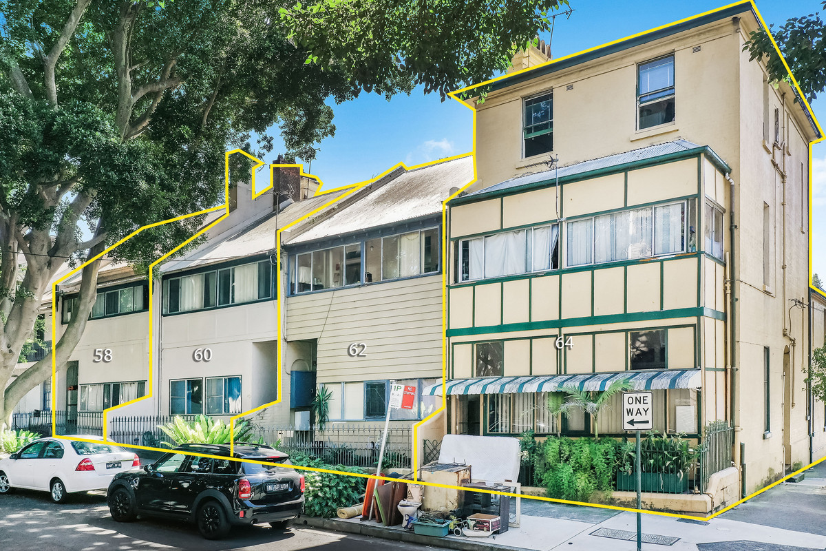 4 giant early century terraces, each 6.5 metres wide each offered in one line. One of Paddington's last significant, undeveloped land holdings. Currently used as a boarding house with 30 rooms. On 837 sqm of land the site boast 26 metre frontage.