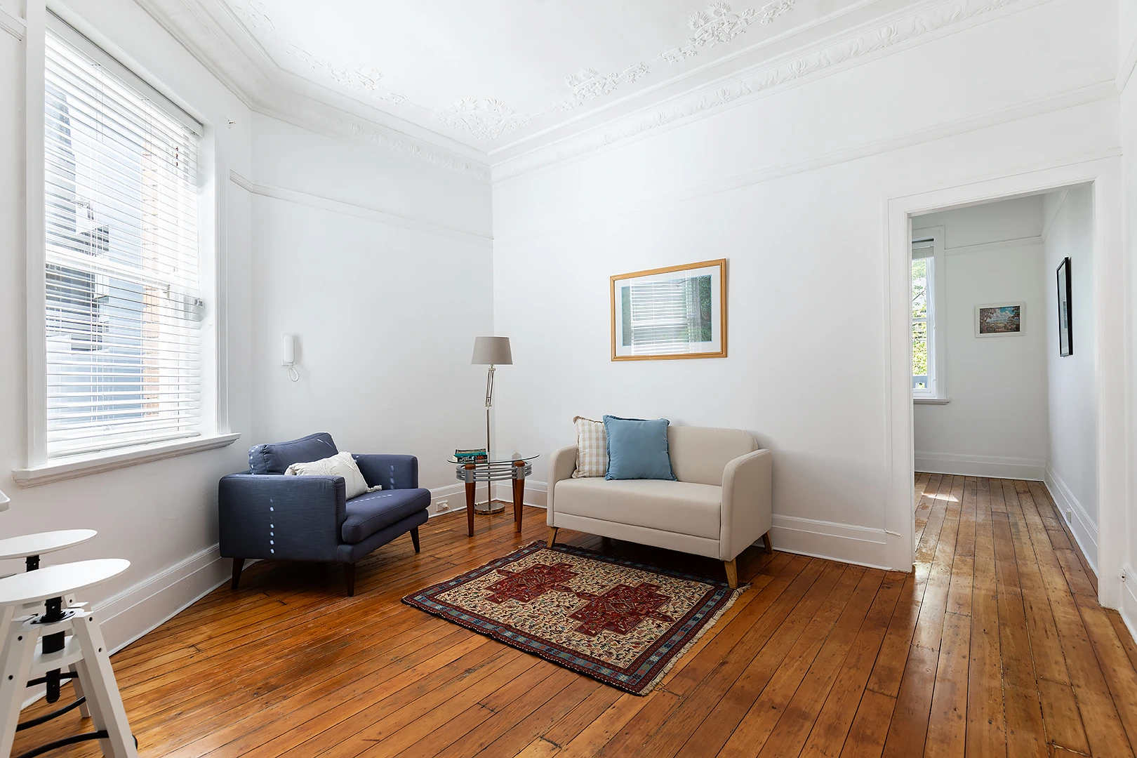 - Light-filled living area with venetian blinds