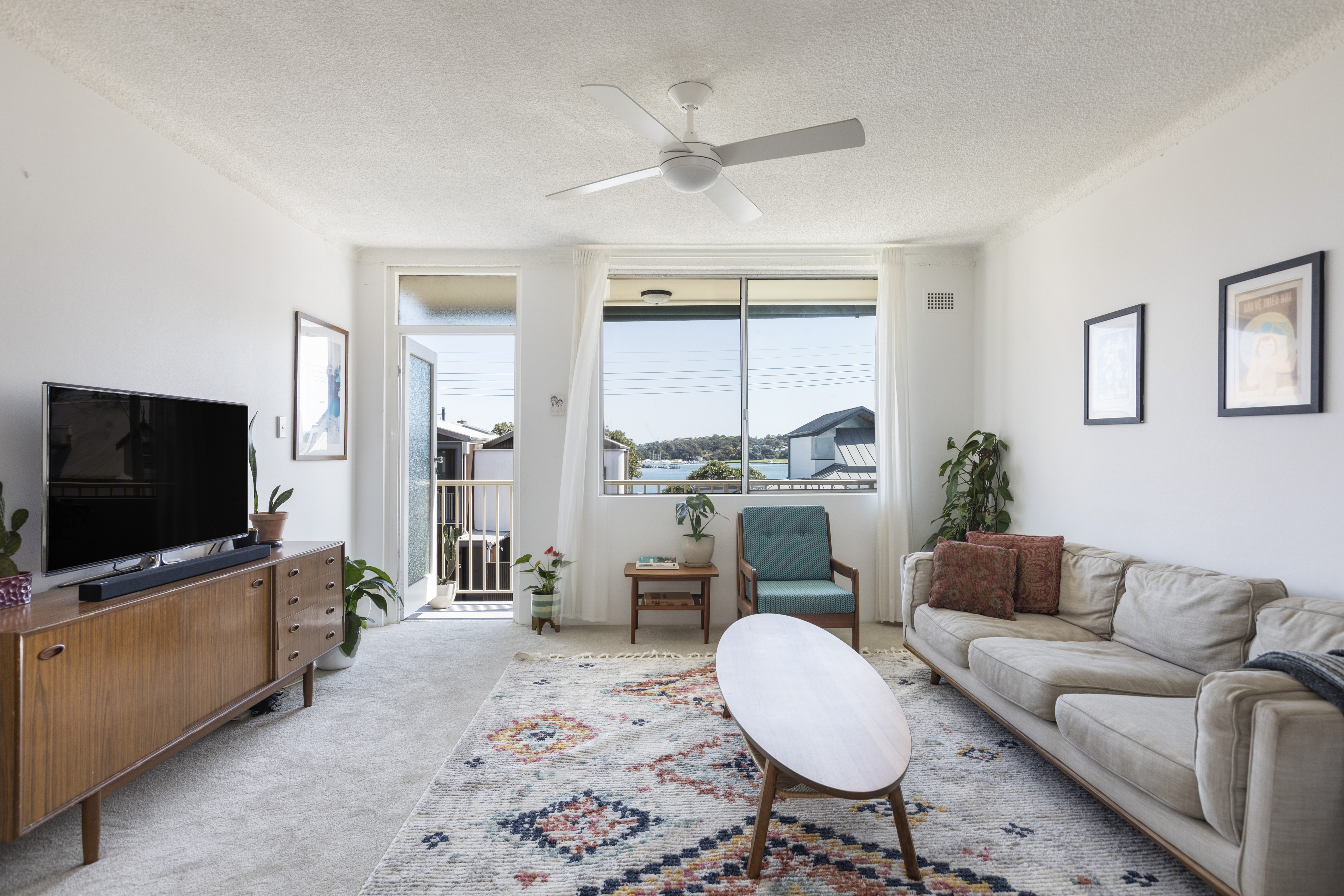 - Open living, carpet, ceiling fan, balcony