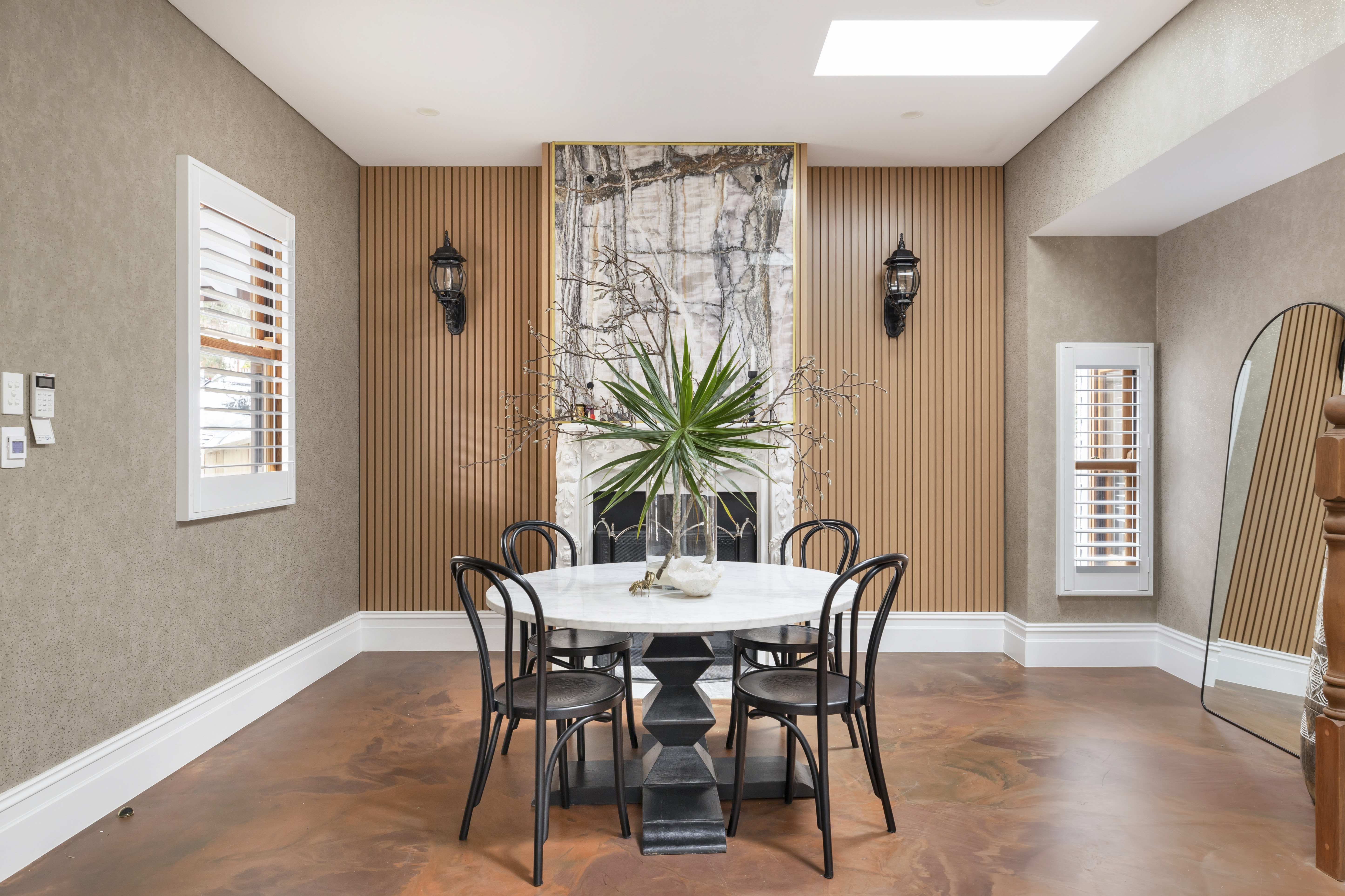 - Luxe stone kitchen, plantation shutters