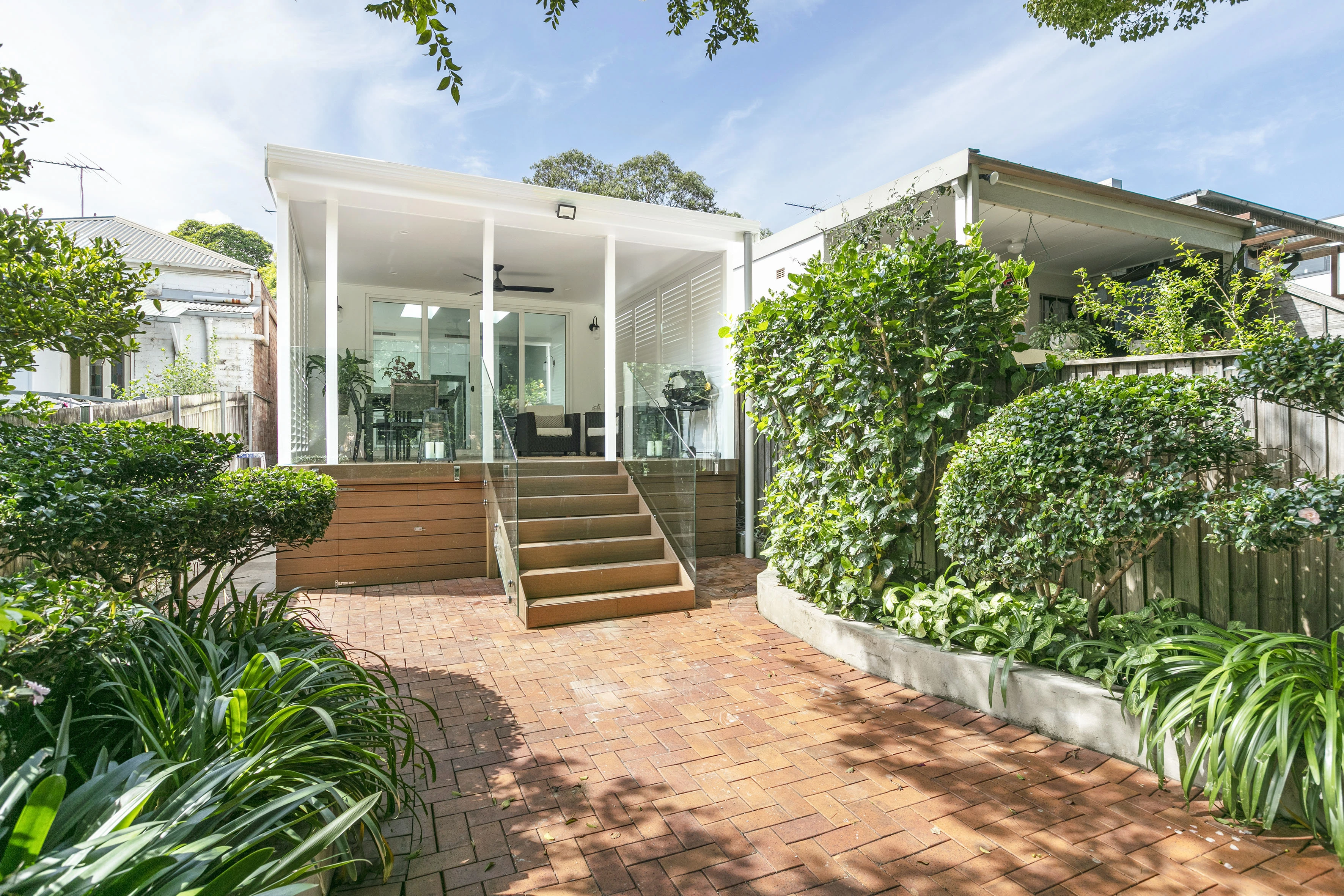 - Privacy shutters, ceiling fan, decking