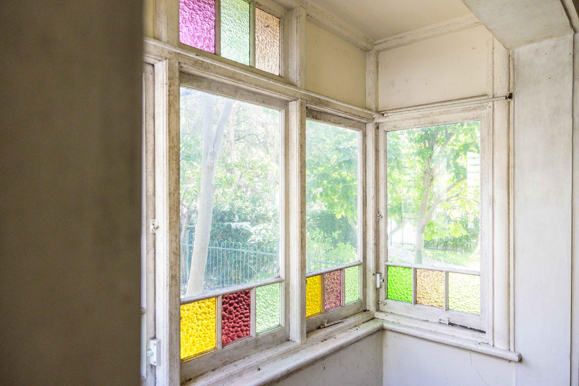 - Original glass, fireplace, high ceilings