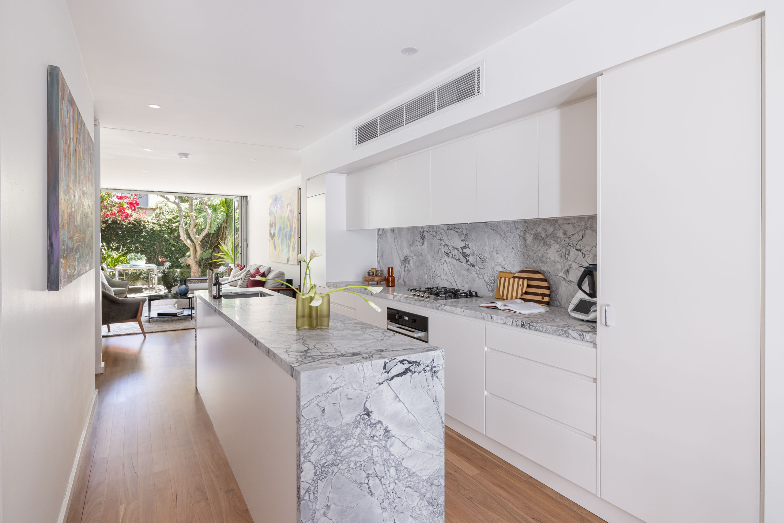 - Sleek marble kitchen, integrated appliances