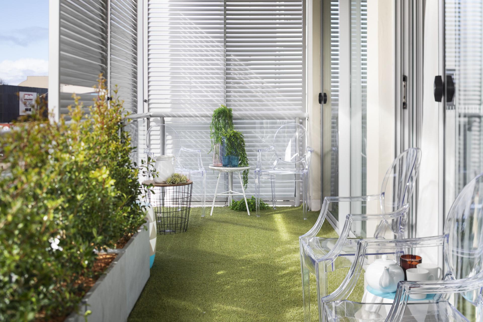 - Open living, full-width glass/balcony