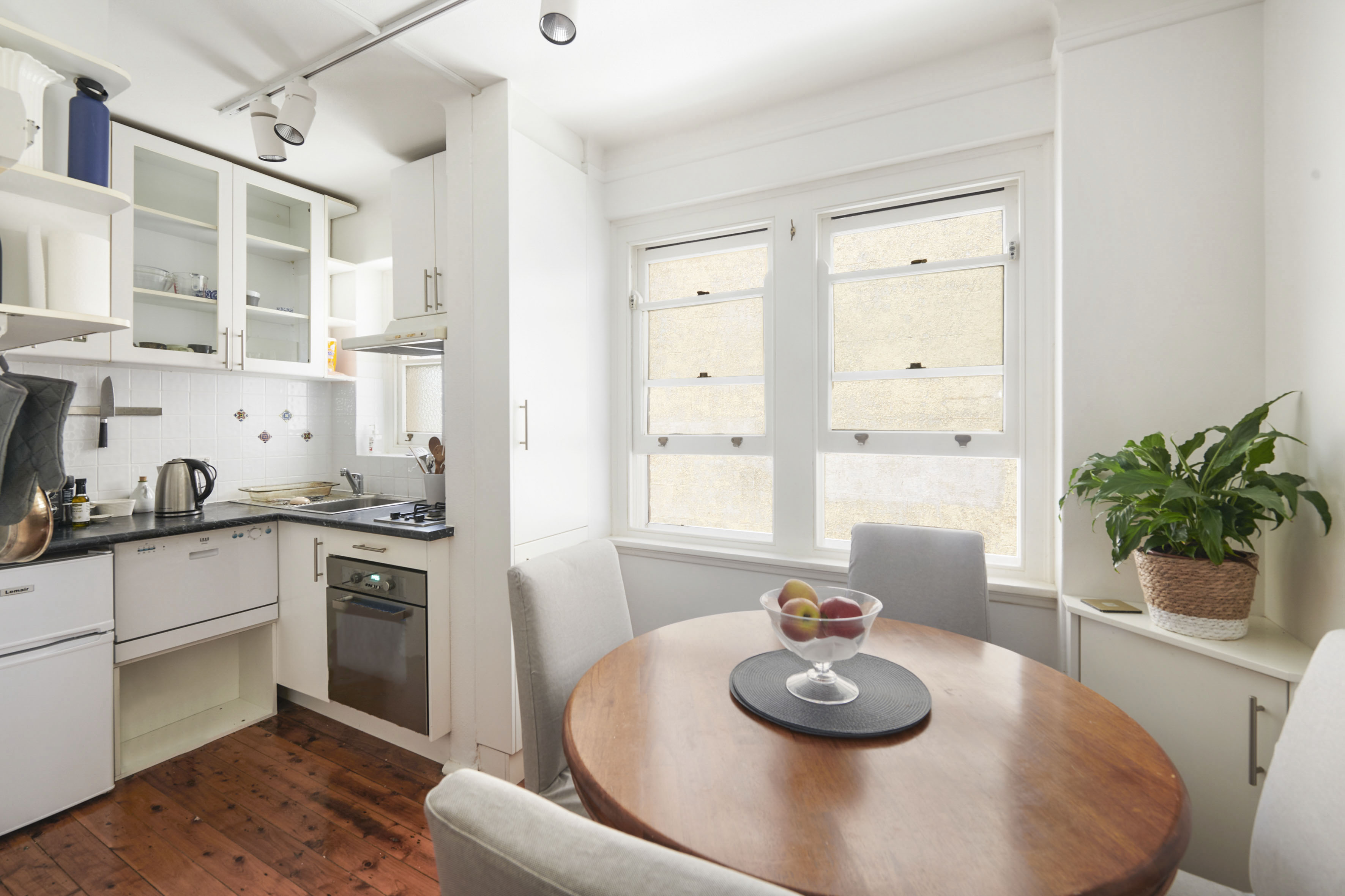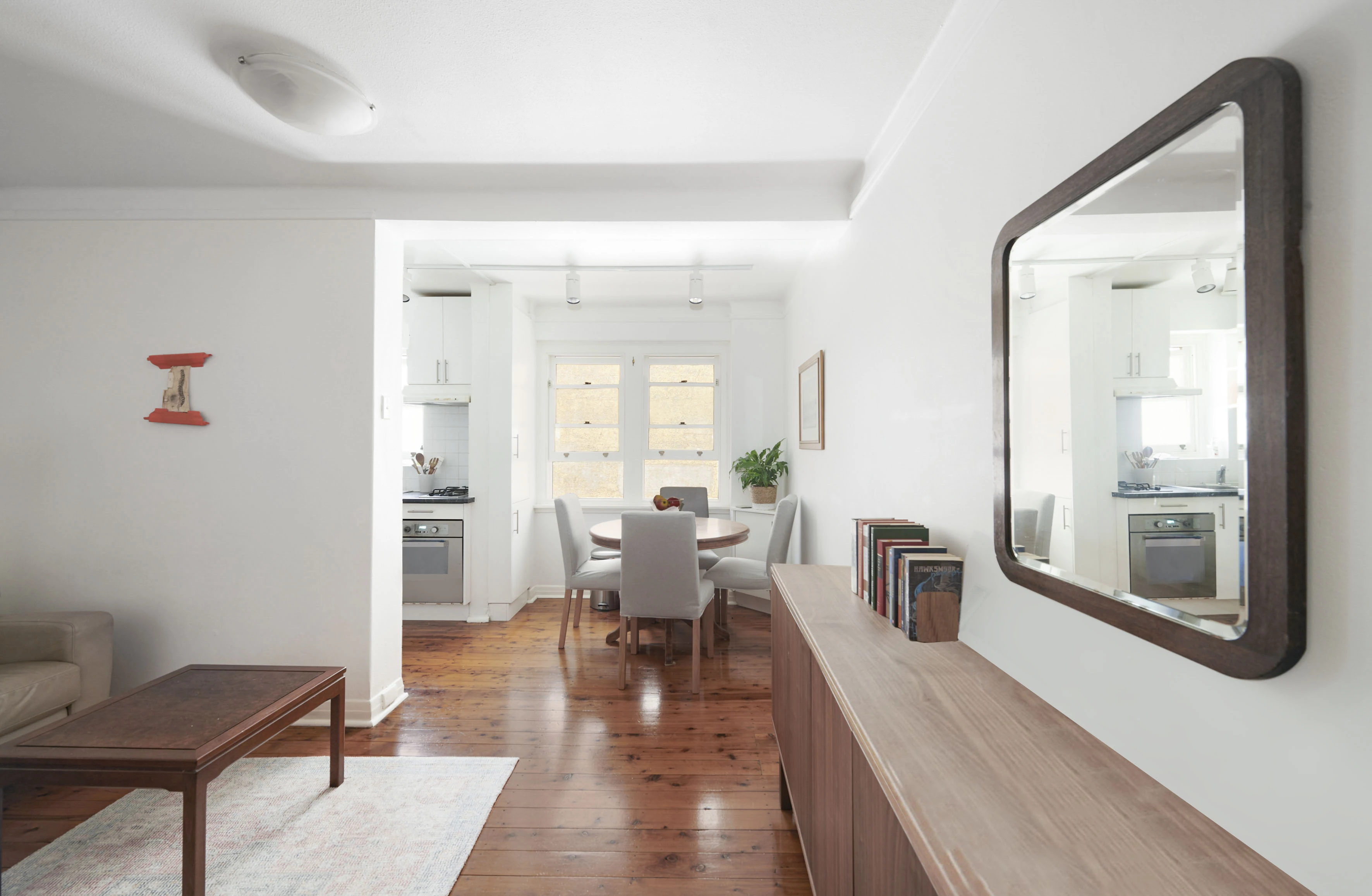 - All-white walls and polished floorboards