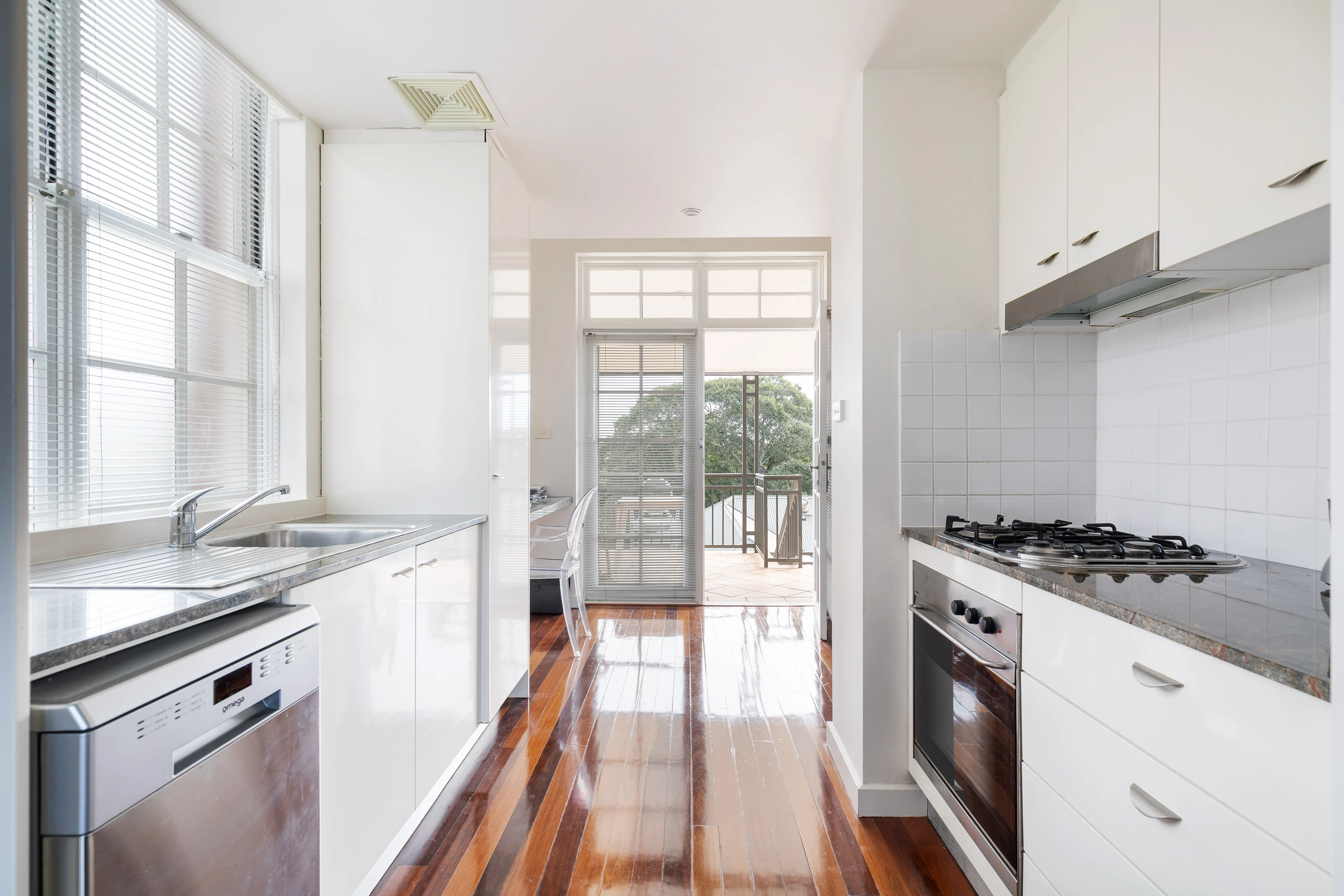 - Galley-style gas kitchen, European apps