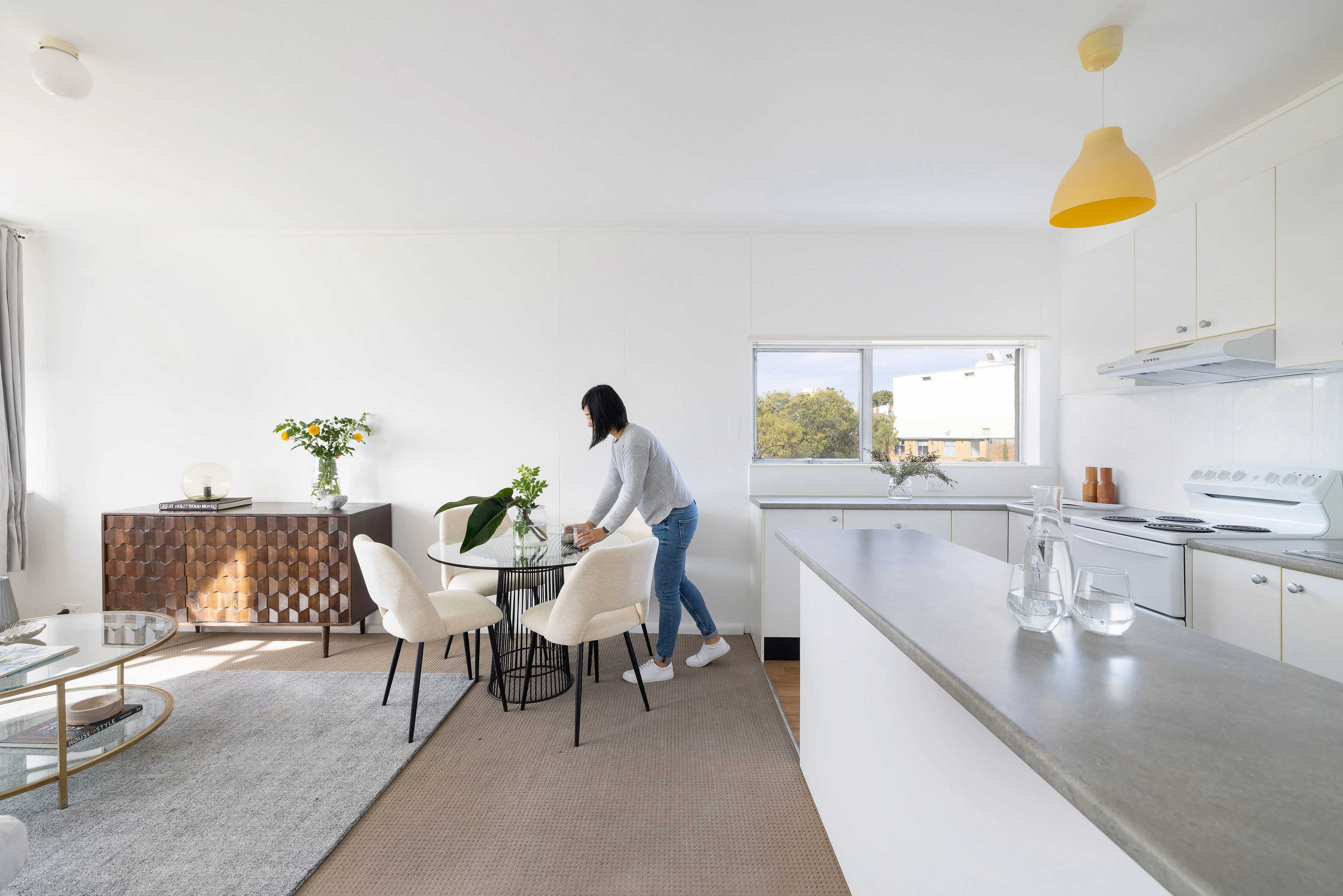 - Open living, carpet, tidy open kitchen
