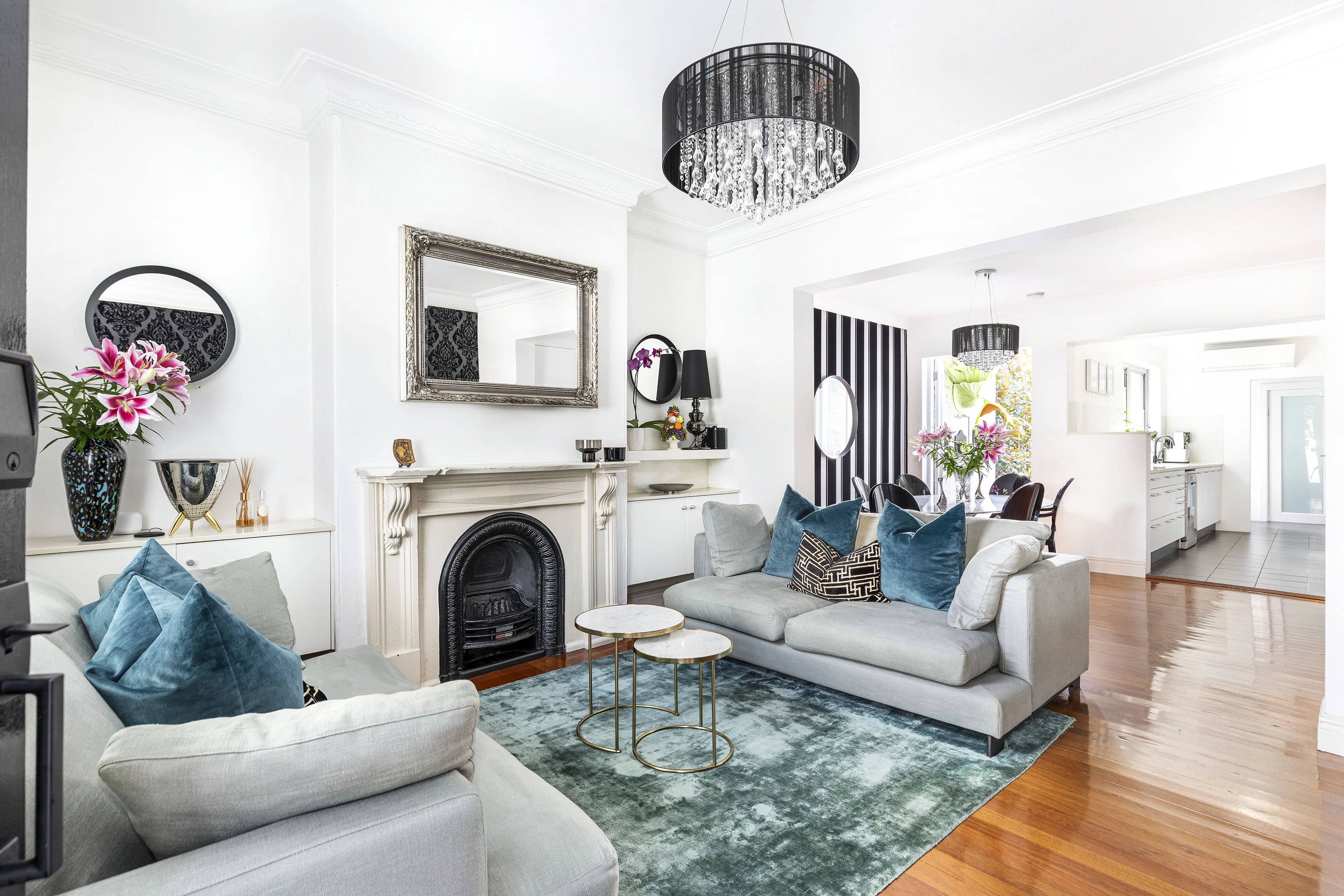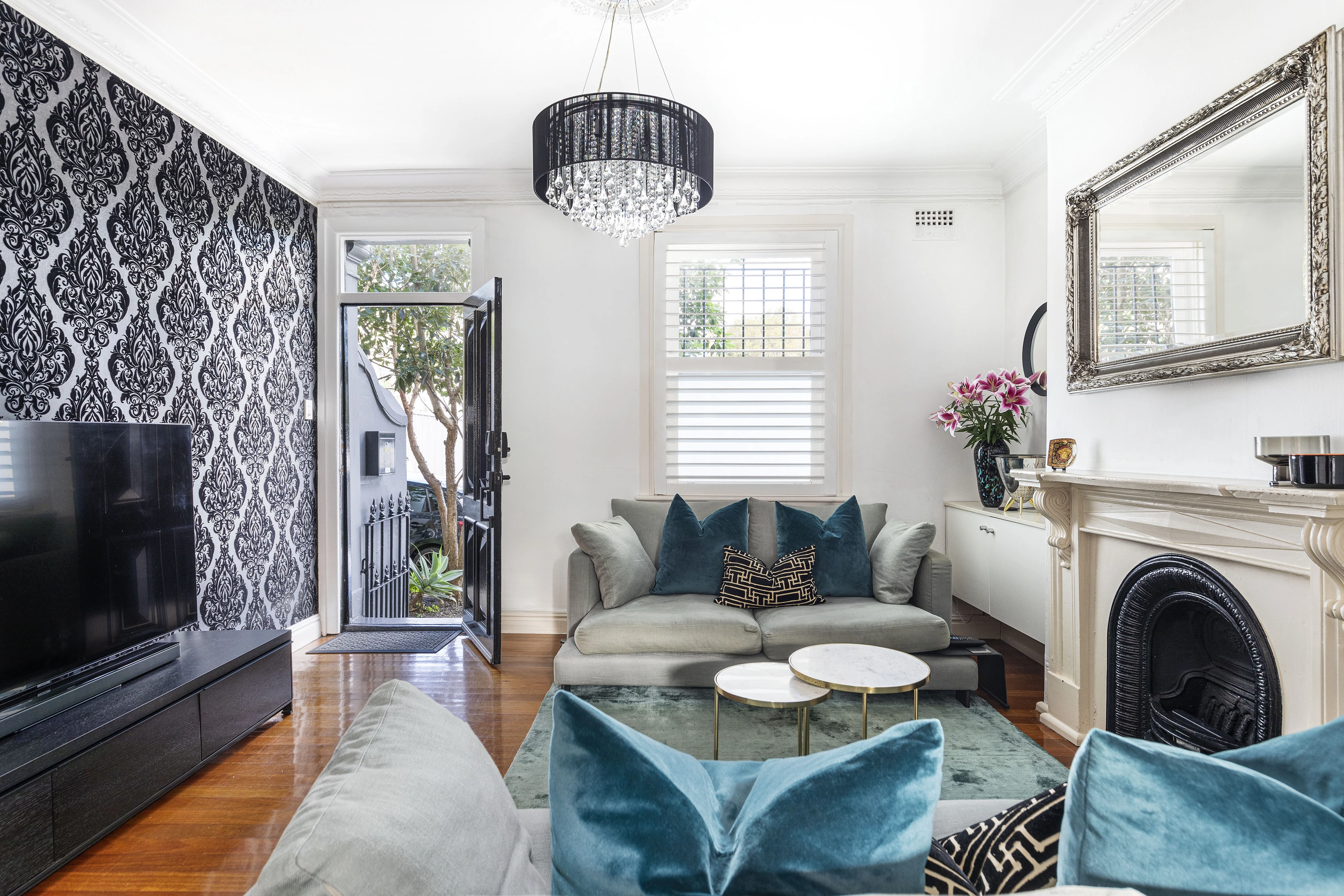 - Timber floorboards, plantation shutters