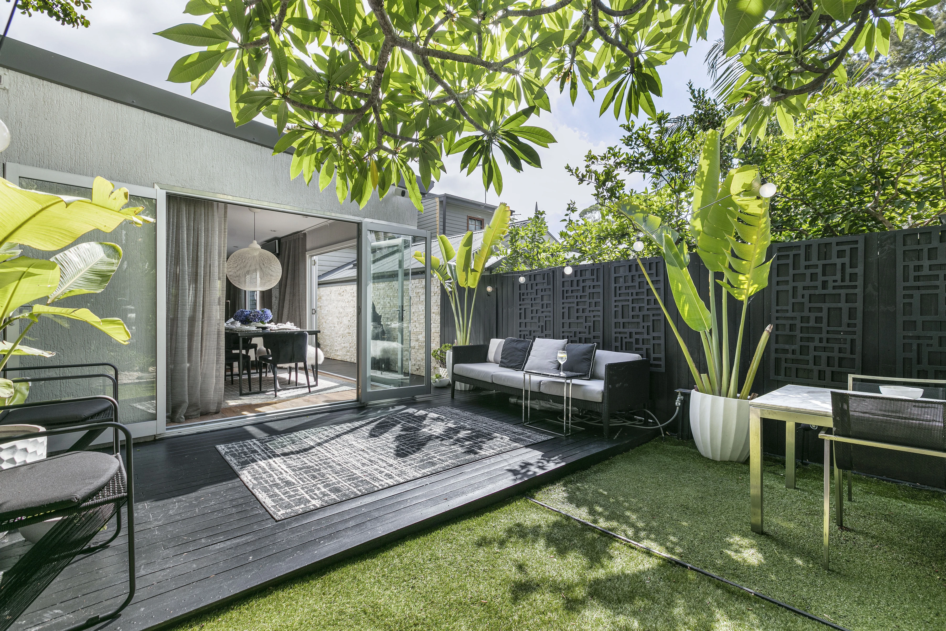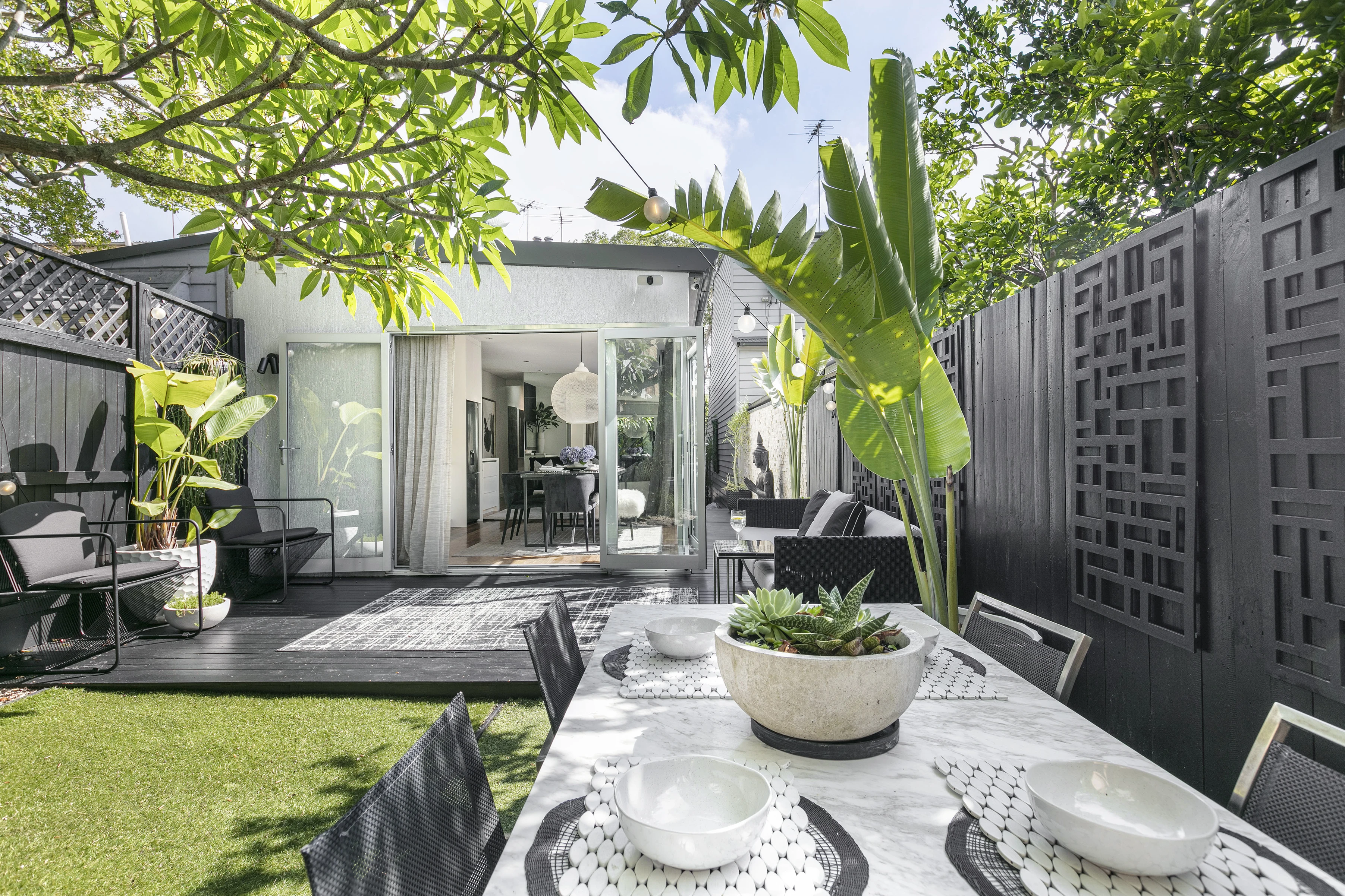 - Lush garden scene set for entertaining