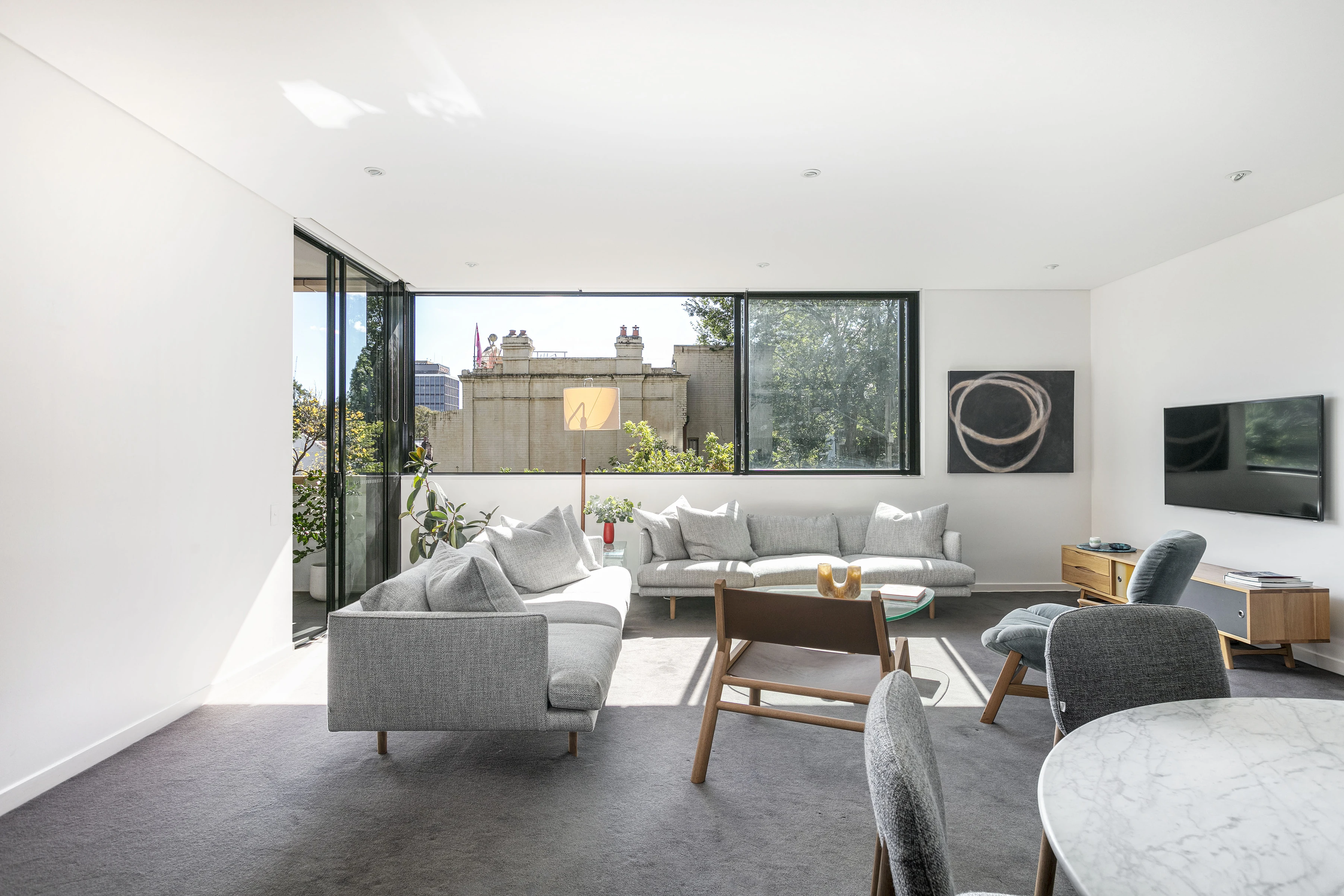 - Floor-to-ceiling glass, leafy outlooks
