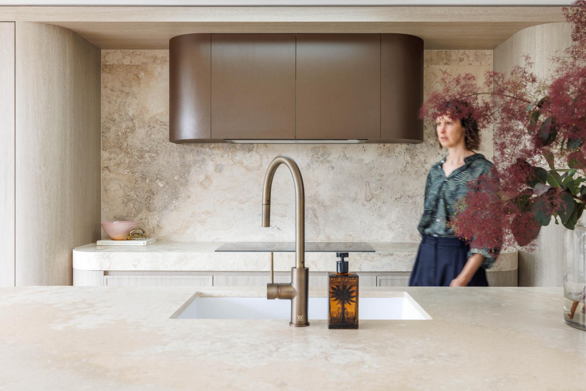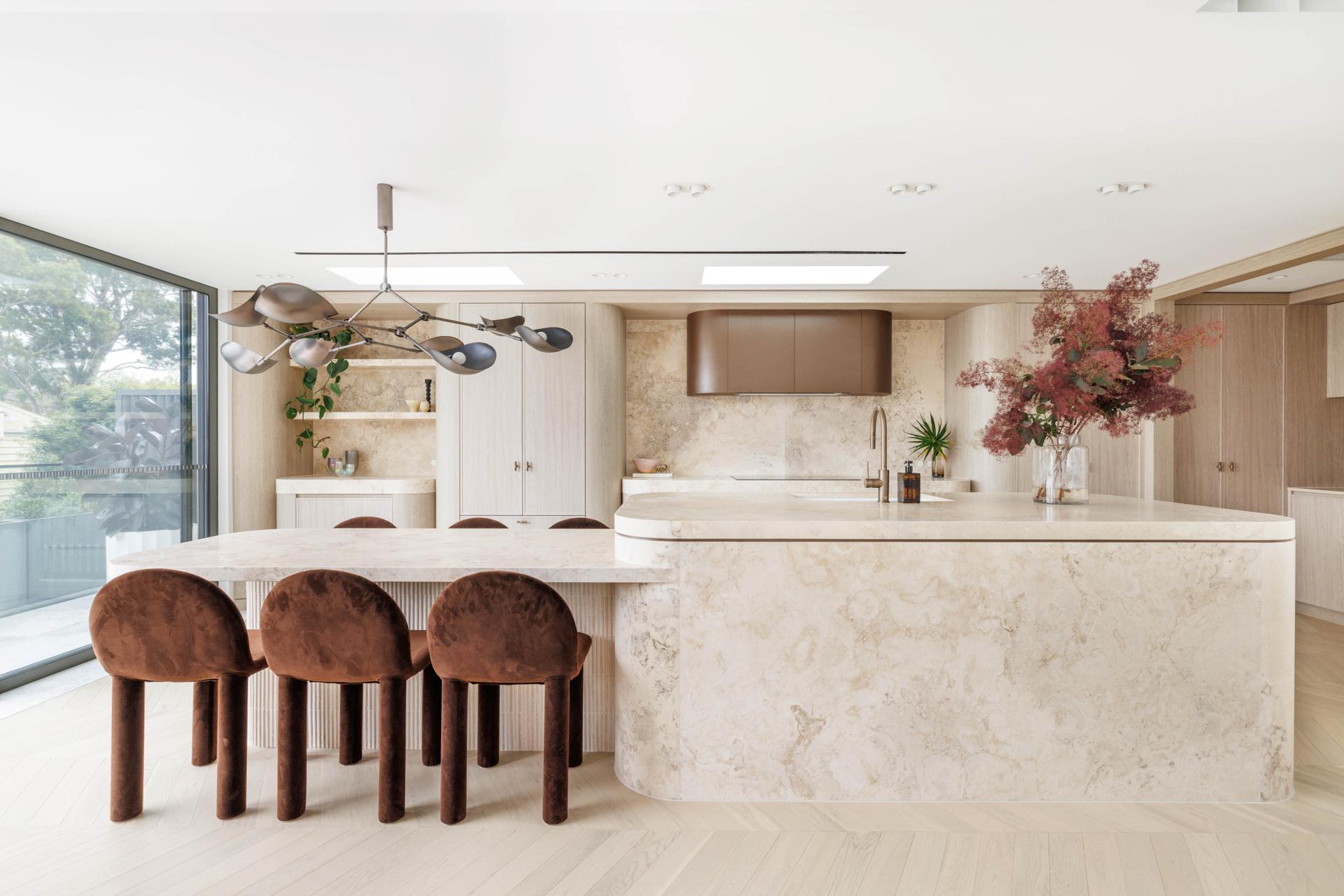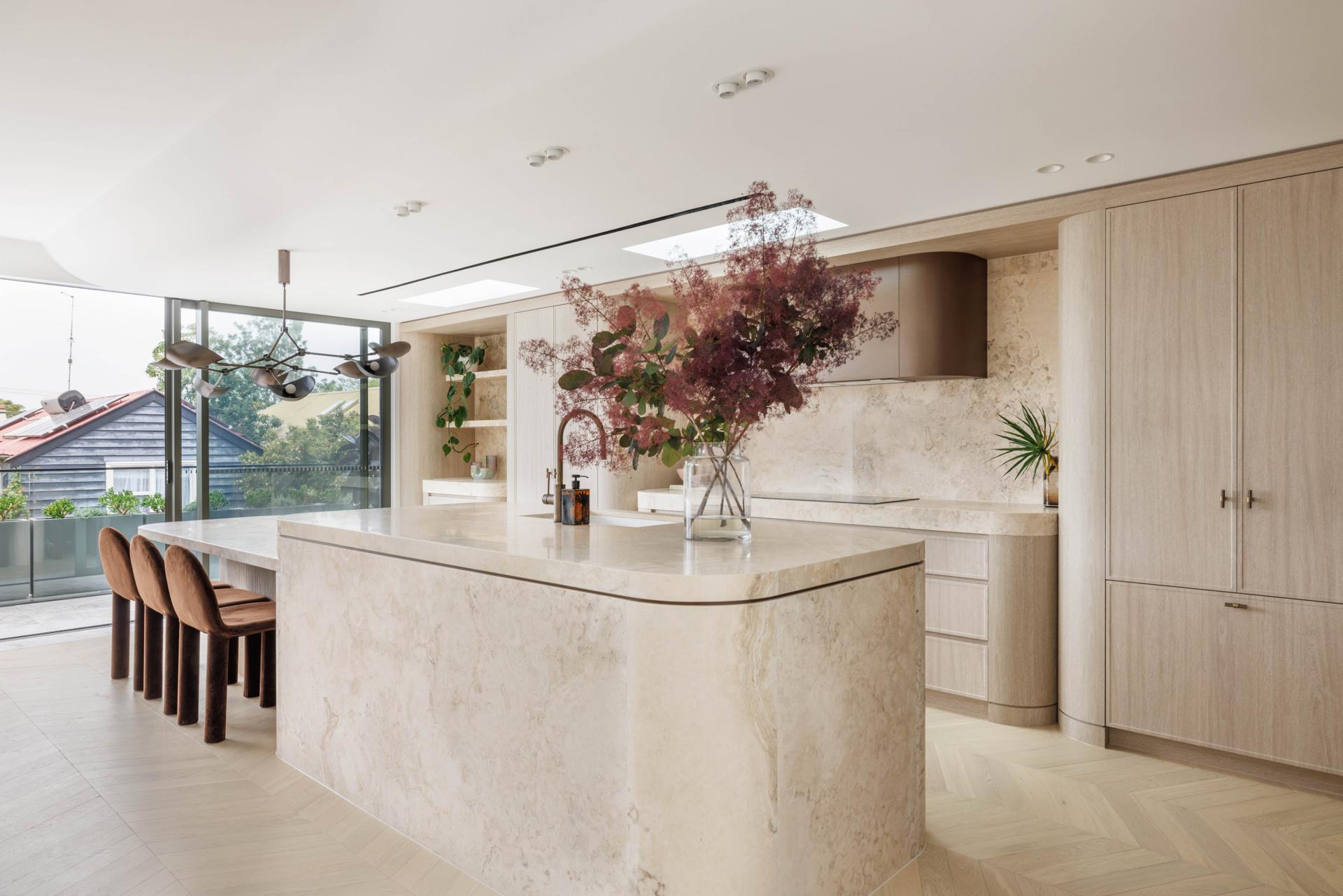 - Travertine kitchen island, shaker joinery