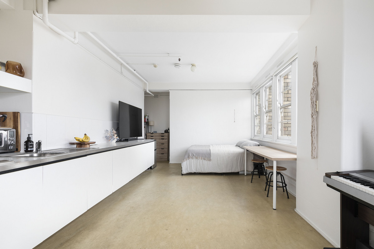 High up in the landmark ‘Belgenny’, this studio apartment is wrapped in north-facing windows, bringing stunning city views, harbour glimpses and abundant natural light. A simple and streamlined fitout celebrates its Art Deco soul, while Taylor Square is at your doorstep and the CBD not far beyond.