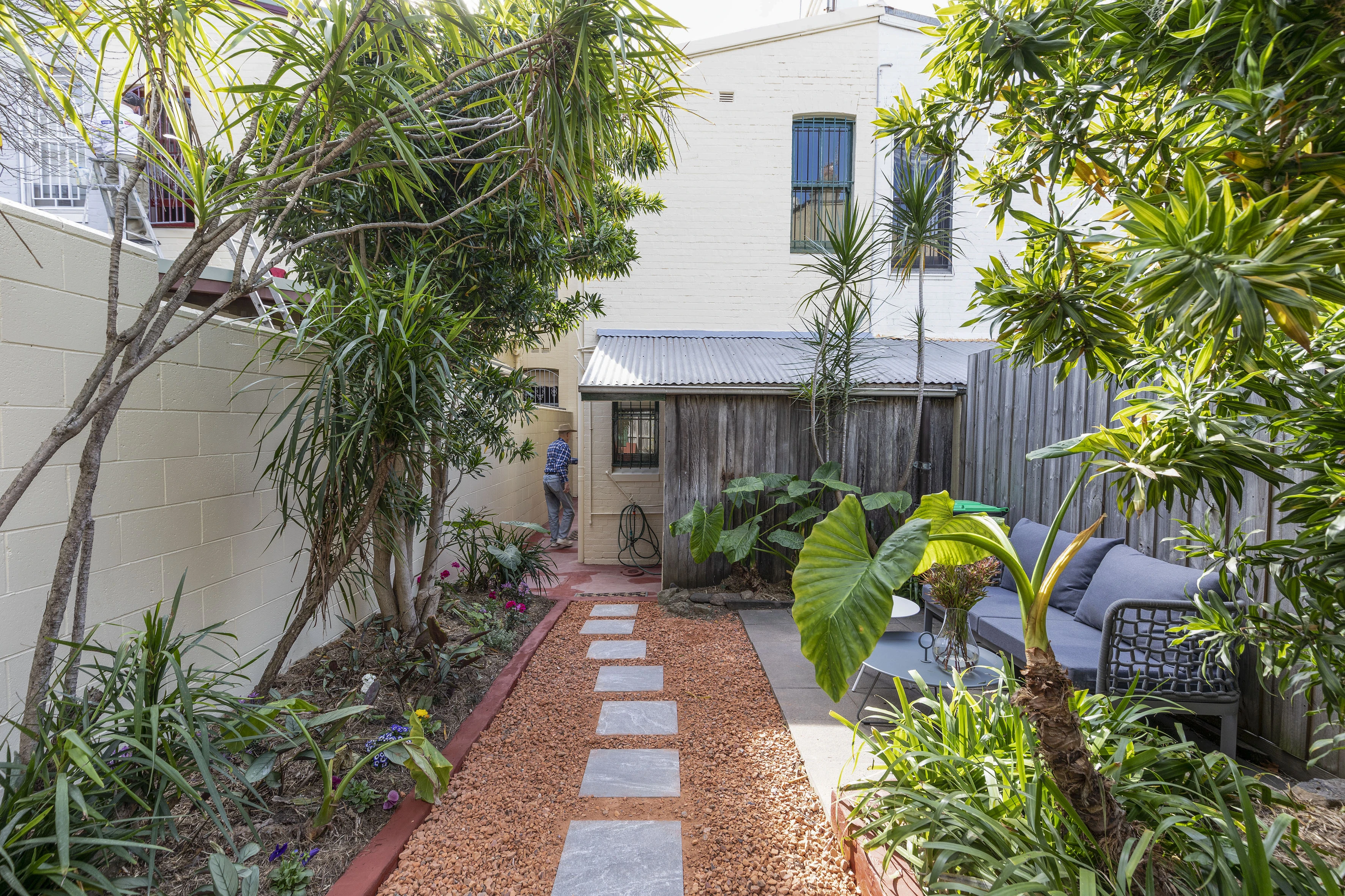 - Paved and landscaped backyard setting
