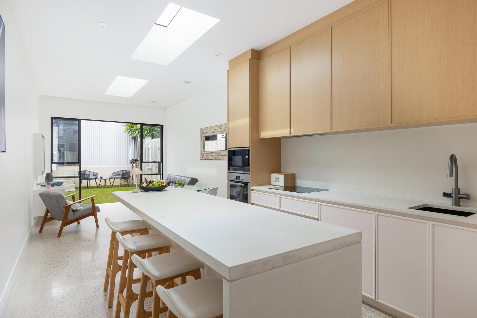 - Stone benchtops, floorboards, gas cooking