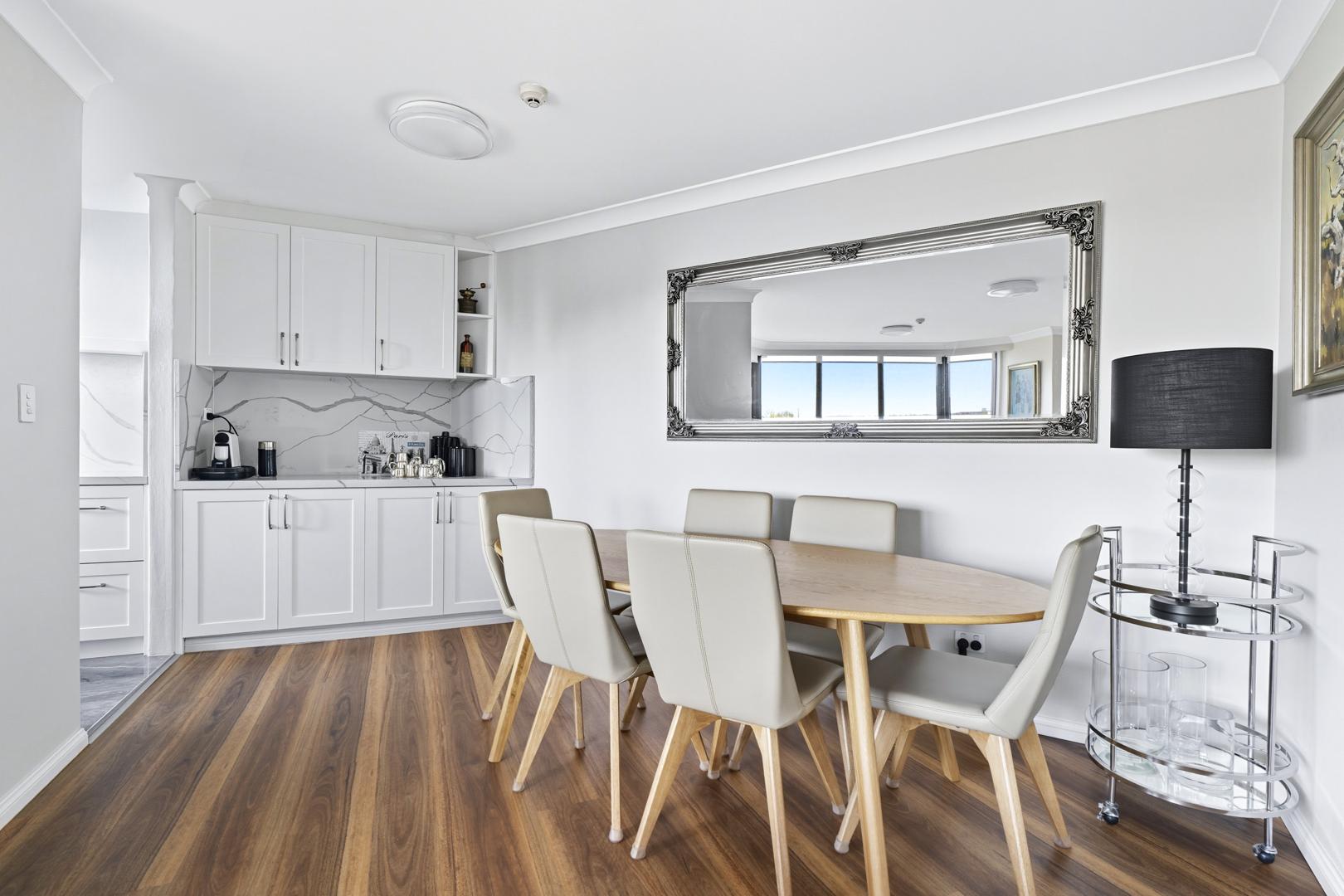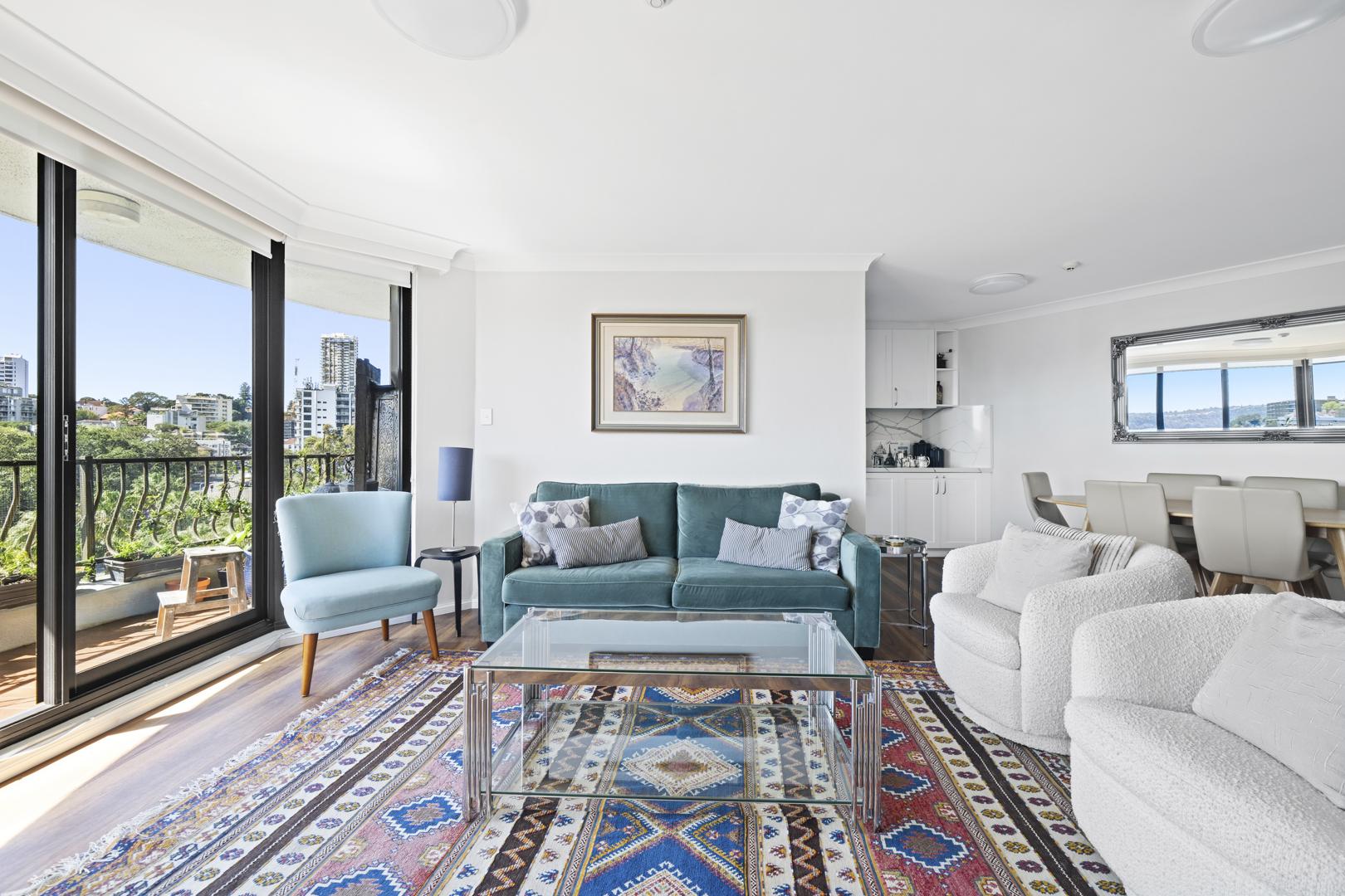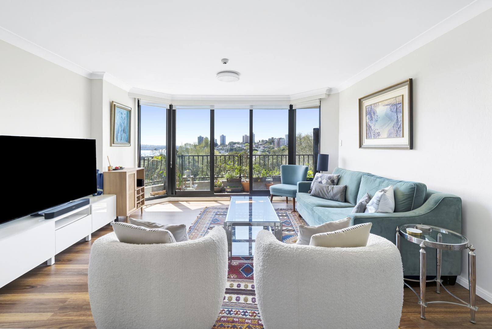 High up in the landmark ‘Bayswater’ building, this apartment opens to a generous north-facing balcony overlooking Rushcutters Bay, Darling Point and surrounding districts.