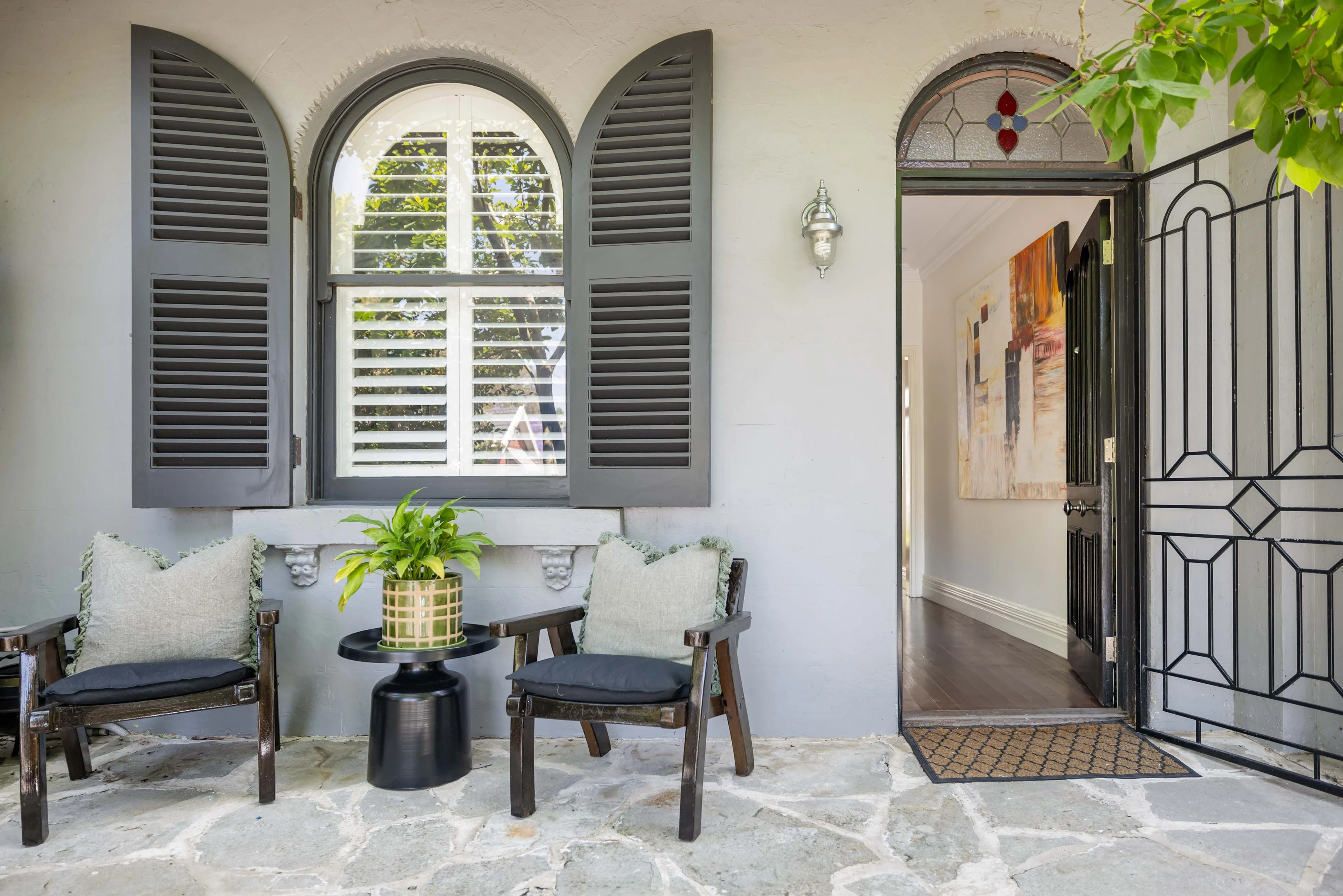 - Ornate ironwork, arched windows/shutters