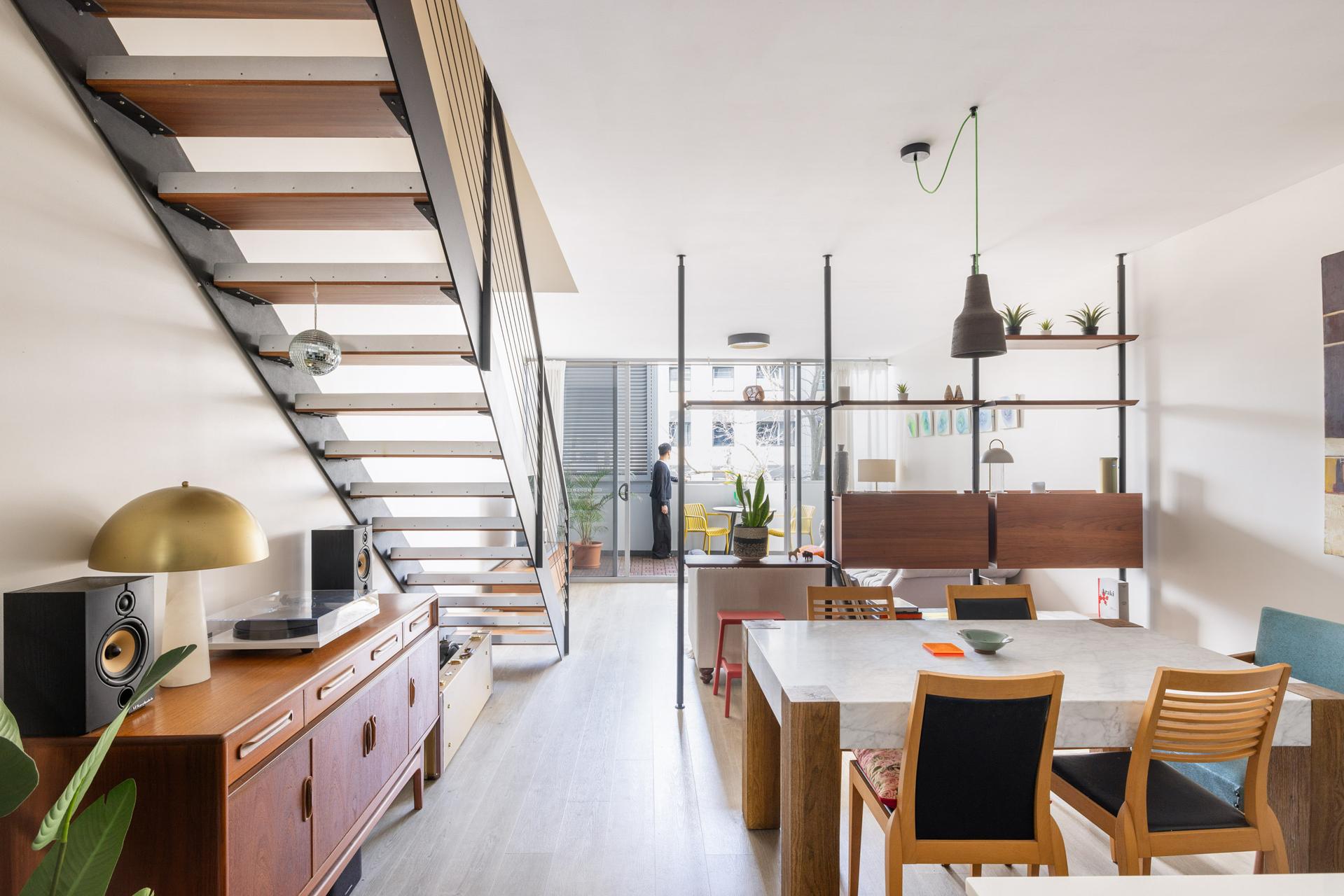 Opening to balcony space at both ends, this split-level apartment has warehouse-like scale and ambience, with a flowing open floorplan and two well-separated bedrooms. City transport and conveniences are at your doorstep, and it’s only a block to the green escape of Alexandria Park and 550m to Waterloo Metro Station.