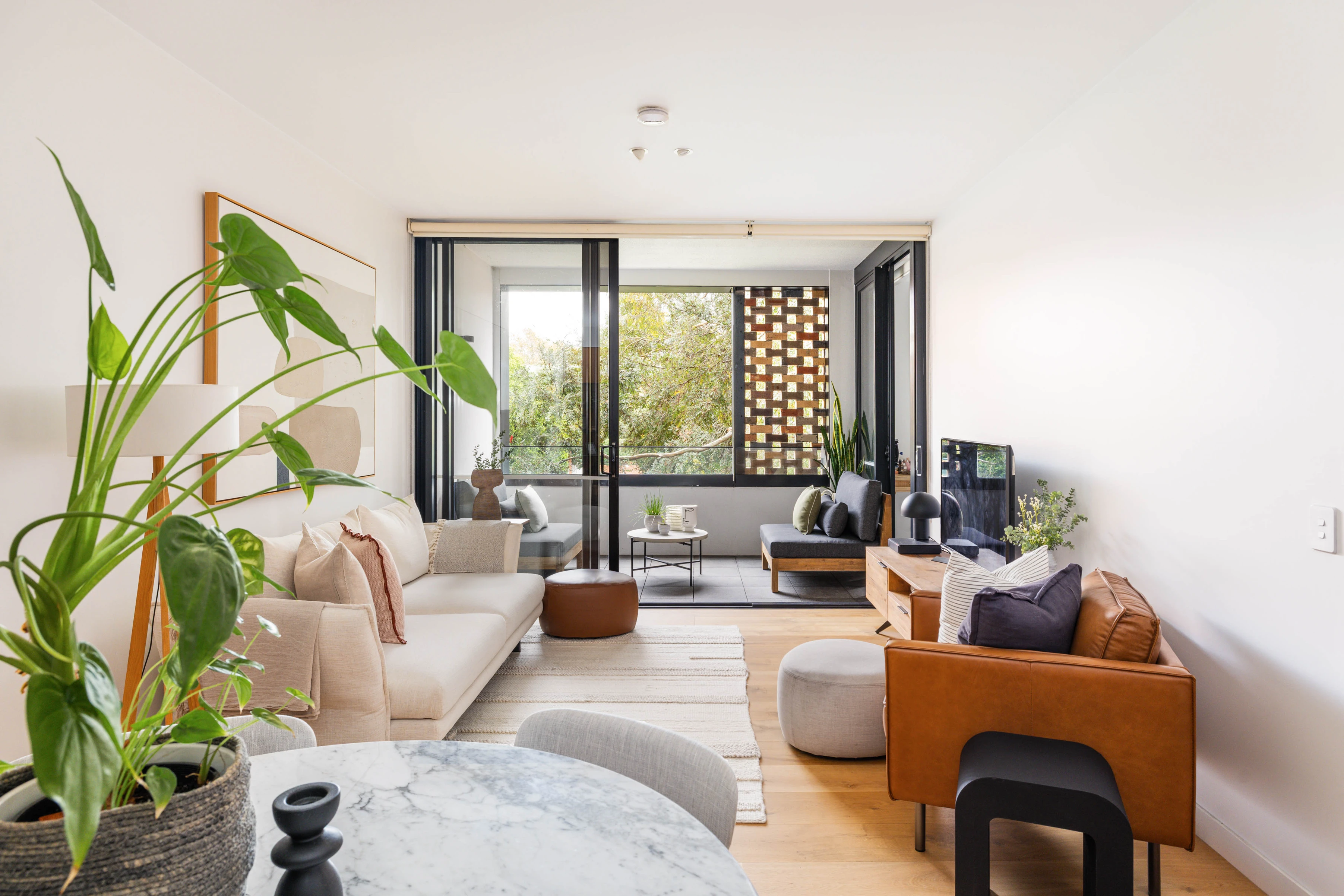 - Nature-inspired palette and wood finishes