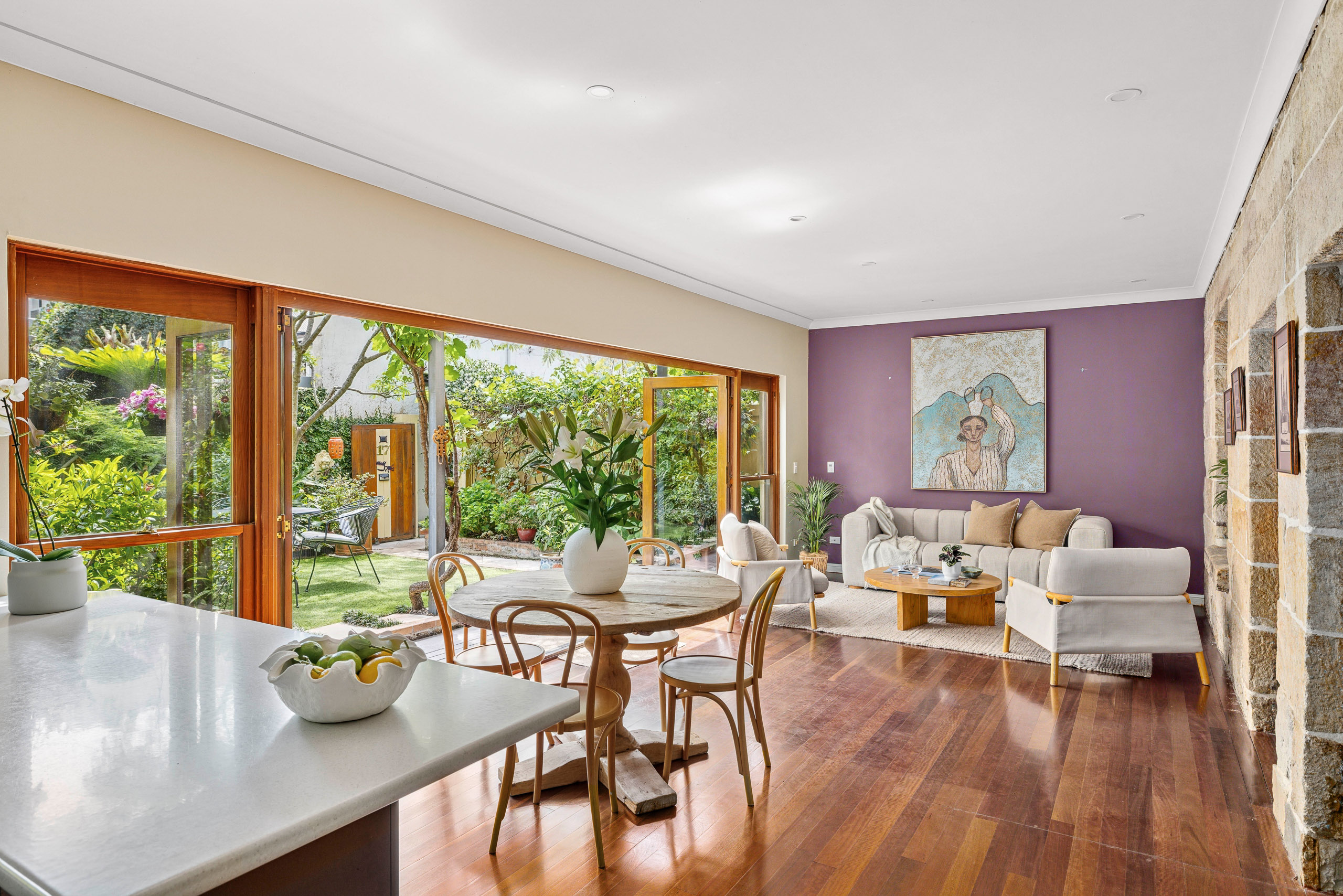 - Warm timber finishes and sandstone walls
